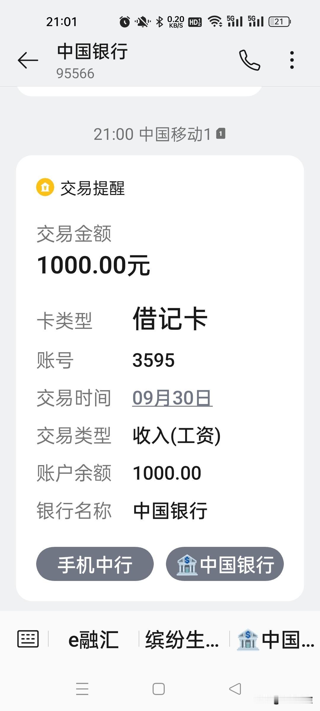 昨晚九点,手机短信是那样清脆好听。我随手打开短信,喔噻,晚九点整,1000块钱到账。 惊喜,开心,溢于言表。双节到了,看来领导还是懂得职工心思的。9月30日的晚上9点,同事白天热议的两千块💰中的一千,终于到账。听说是绩效和取暖费,也不知道发的是哪一年的。也不管是啥钱了,反正发钱就高兴,高兴一会儿是一会儿。 过双节有钱花了。即使今天值班,心里美美的,开开心心的。[大笑][大笑][大笑]