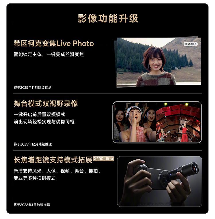 喜新不厌旧,接下来vivo将会为X200系列带来一系列的新功能,在影像部分,将会带来全新希区柯克Live Photo(今年11月开始陆续推送)、舞台模式双视野录像功能(今年12月开始陆续推送)。