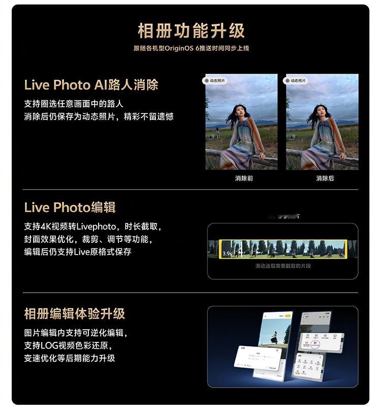 OriginOS 6的推送,X200系列也能体验到全面升级的相册功能,包括Live Photo AI路人消除、Live Photo编辑等功能。
