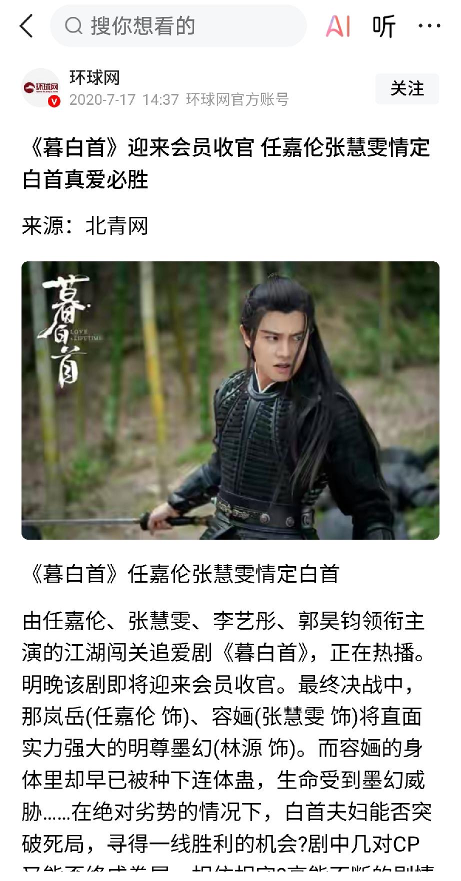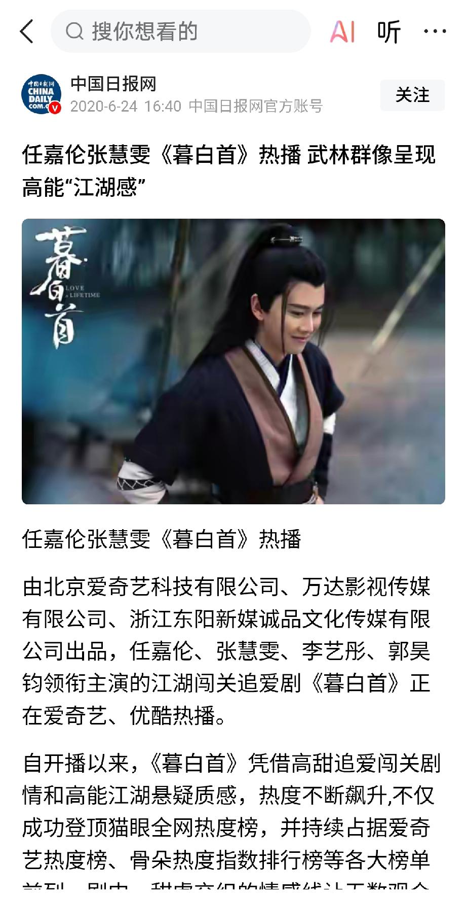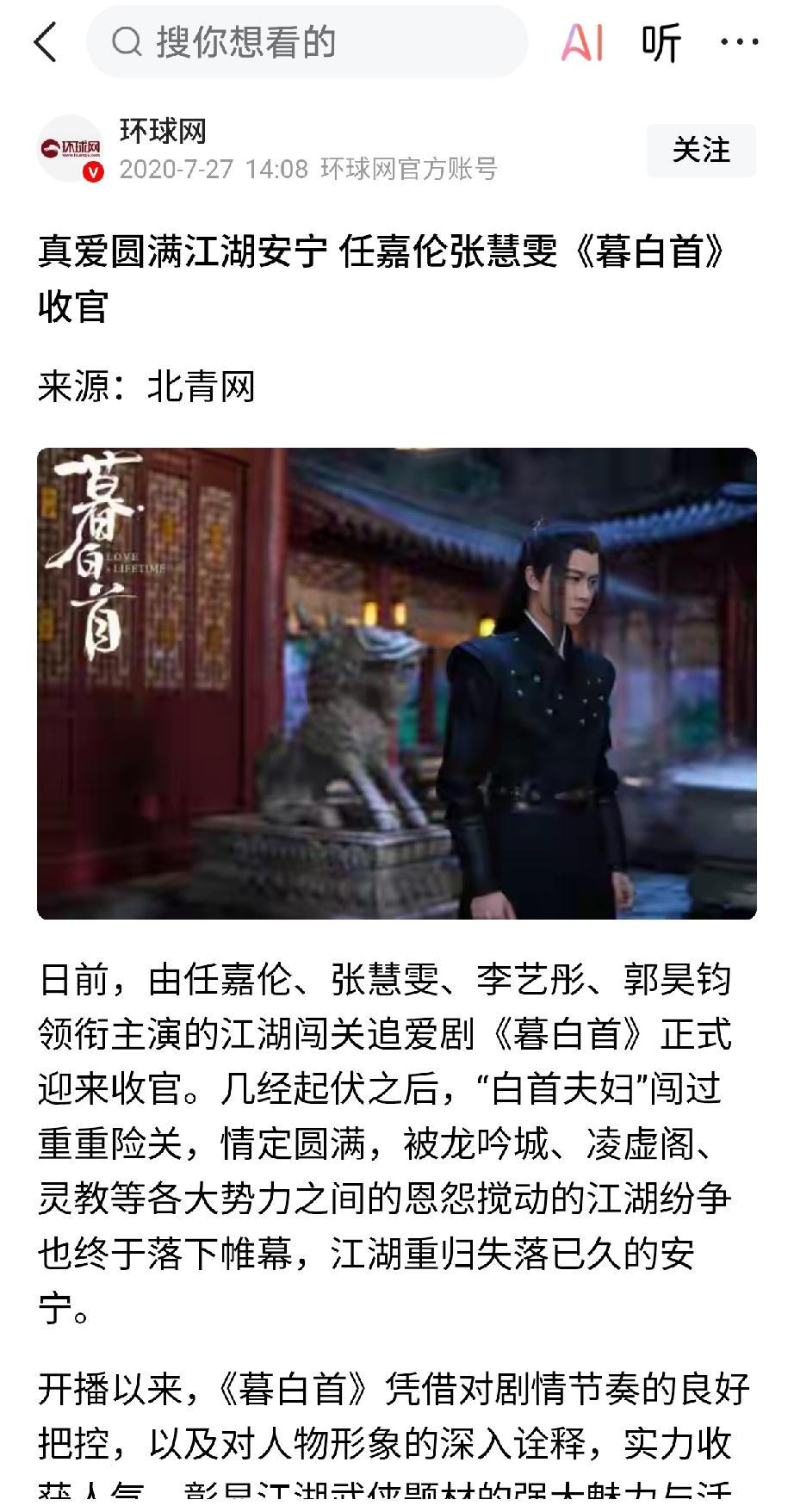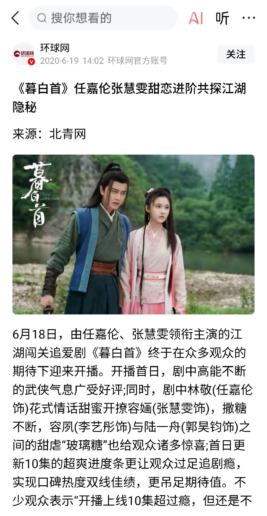 任嘉伦其它剧有这样吗?《无忧渡》环球日报也发了几篇,但似乎也没有一连6篇之多。 当年《暮白首》播放时,环球日报居然连发了6篇剧评,其中有三篇是转载自北青网(北京青年报》,可见官媒对这剧的重视份量。