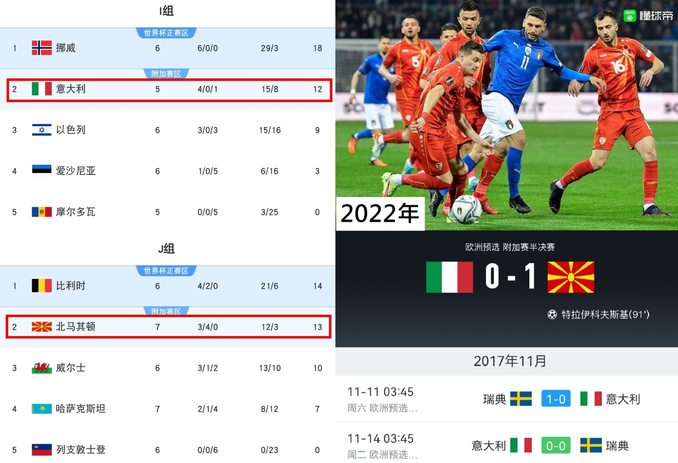 我就说意大利今年的附加赛不会又要和北马其顿、瑞典碰上吧? 上两次意大利无缘世界杯就是被这俩苦主淘汰的。 目前北马其顿排在J组的小组第二,而瑞典有欧国联的直通附加赛的名额。 不知道德国会不会也要去踢附加赛,就怕纳子整活主场再输斯洛伐克那就完犊子了。 其实我觉得欧洲竞争还是太激烈了,第二就去附加赛,16个名额还是太少了,应该给到20个才合理,那亚洲的8.5个名额简直就是浪费,什么臭鱼烂虾都能去世界杯了。