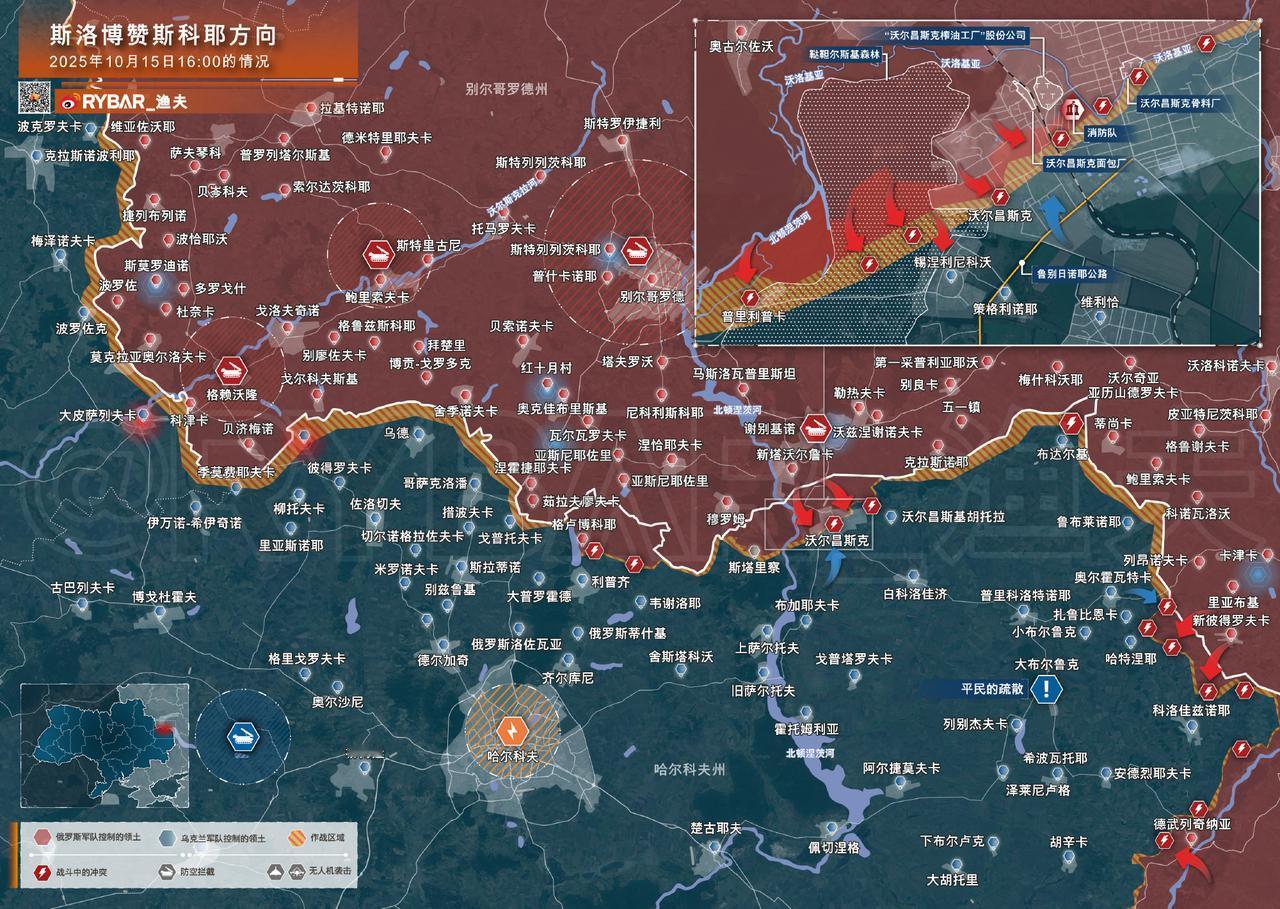 【俄军在沃尔昌斯克方向取得进展】 在斯洛博赞斯科耶方向,俄军继续在沃尔昌斯克地区推进。西翼方向上,在普里利普卡—锡涅利尼科沃一线,突击部队在鞑靼森林中稳步前进,已接近多个居民点,当地战斗异常激烈。俄军在沃尔昌斯克地区内也取得了显著成果。 📌如果俄军能在沃尔昌斯克以西进一步突破,并控制或至少在锡涅利尼科沃中部展开交火、同时向基尔皮奇诺耶推进,那么乌军在城内残余据点的驻守部队将陷入被包围的危险之中。 ❗️考虑到俄军在东部的蒂霍耶地区同样取得了局部进展,目前总体态势对俄军而言相对有利。不过,这并不意味着战斗变得轻松——乌克兰部队仍在不断发动反击,并积极利用其在无人机领域的优势。 俄乌突发特别军事行动俄乌战争海外新鲜事 来源:RYBAR_渔夫
