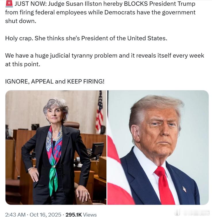 左派激进法官苏珊·伊尔斯顿禁止特朗普总统在民左党关闭政府期间解雇联邦雇员。