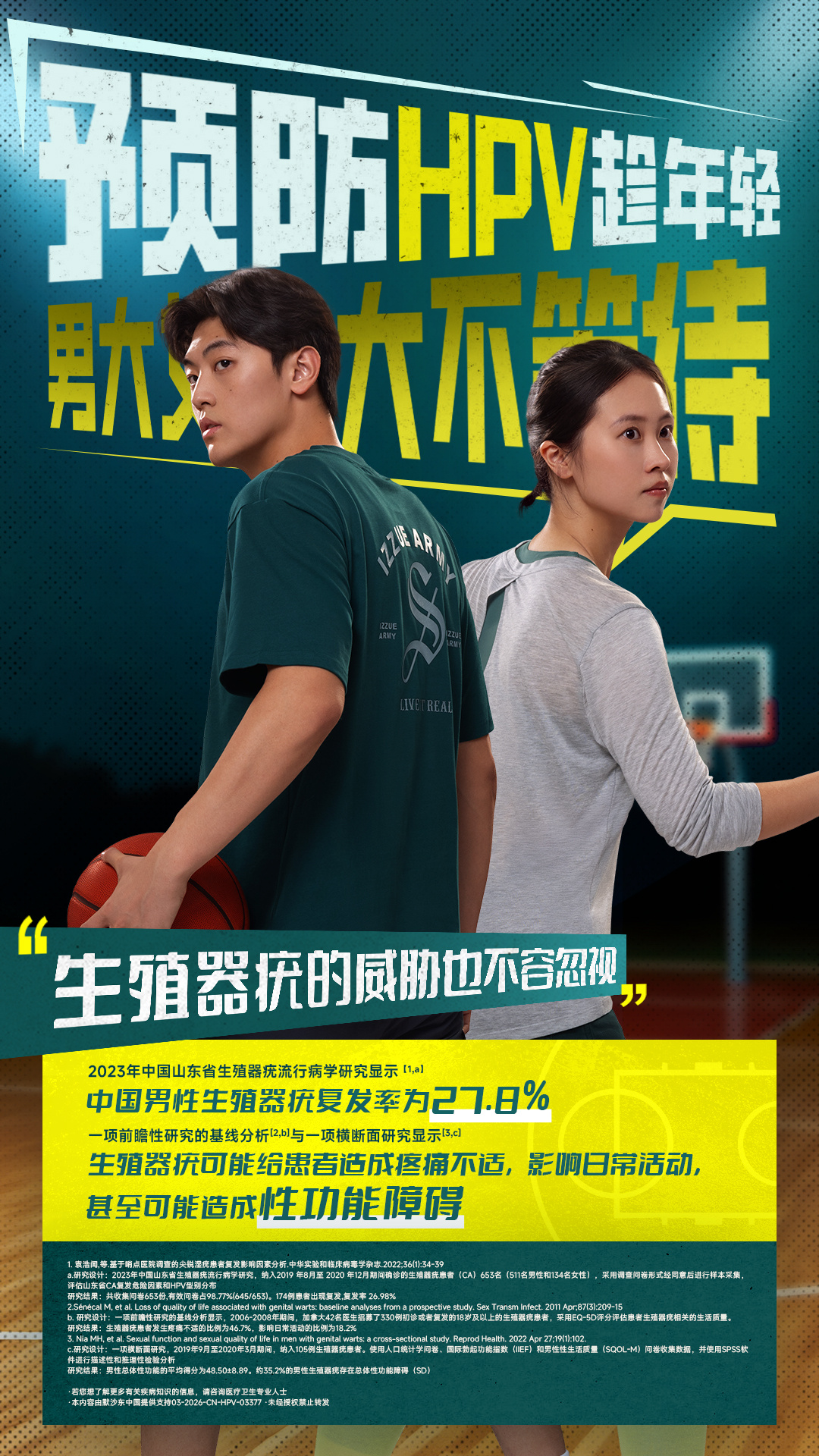 传下去:【大学就是预防HPV的关键时期】 一项基于中国人群的队列研究显示,一方持续感染HPV,有可能增加伴侣的感染风险。HPV感染后大多可被免疫机制自行清除,但是持续感染HPV仍有可能会导致多种疾病。保护自己,也是保护你爱的人一起组队防守,把健康防御搭建起来!预防HPV男大女大不等待男女共防HPV要趁早