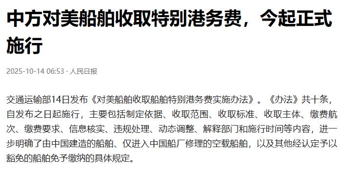 中美分别开收“港口费”,中方细则已出台,美方只有一句话:自己看着办 10月14号这天,中美两边几乎同时宣布对进入本国港口的对方船舶收“港口费”,但这事往细了说,性质和场面简直差了十万八千里。美方那边先挑的头,说白了就是想借着收费打压中国船舶业,还琢磨着能把造船业吸引回美国,可明眼人都知道这事儿压根不现实。 中方这边则是实打实的防守反击,你都把规矩砸到脸上了,总不能坐那儿挨打,只不过这反制的章法,跟美方的混乱比起来,简直是两个极端。 先说说美方这波操作的由头。 早在去年4月,美国贸易代表办公室就拿“振兴本国造船业”当幌子,用所谓的“301条款”对中国海事领域发起调查,今年4月干脆公布了最终措施,定在10月14号起,对中国船东运营的、或者中国造的船舶收歧视性港口费,还留了180天过渡期。 可懂行的都清楚,这理由站不住脚。现在全球造船业基本看中国脸色,截止到2025年6月底,“十四五”期间中国接的新船订单占了全球64.2%,完工量也超过一半,连续16年都是世界第一。 反观美国,民用船舶建造成本是中韩的3到5倍,自己造的船又贵又没竞争力,就算把中国船挡出去,船公司也只会转用韩国、日本造的船,根本轮不到美国船厂接活。 美方不光动机站不住脚,连政策执行都闹了个大笑话。本来他们的海关与边境保护局(CBP)早就发了公告,说对中国相关船舶按每净吨50美元收费,以后还会涨到140美元,中国造的船还要按集装箱额外加钱,要求船东在抵港前3天通过平台缴费,不然就扣船不让装卸。 可偏偏赶在10月14号新规生效前,美国政府停摆了快半个月,75万联邦雇员被迫休假,还有几十万人无薪上班,CBP压根没人手干活。这下好了,新规没法执行,CBP居然把这个烫手山芋扔给了船东,让他们“自觉申报”缴费,说白了就是一句“自己看着办”。 这操作简直把国际航运业看傻了。要知道一艘巨型油轮光港口费就得几百万美元,现在收费主体缺位,全靠船东自觉,这不等于给逃费开了绿灯?奥地利一家货运代理公司的高管都吐槽,这政策只会带来长期成本负担,根本达不到增强供应链韧性的目的,最后绝大部分费用还得美国进口商扛着。 再看中方这边的反制,那叫一个清清楚楚、明明白白。其实中方从一开始就不想走到这一步,中美伦敦经贸会谈时还主动沟通,给美方提供书面回应,甚至提了合作建议,可美方压根不接茬,非要硬来。 既然谈不拢,那就只能对等反制,10月10号交通运输部直接发布了《对美船舶收取船舶特别港务费实施办法》,十条规定把方方面面都讲透了,10月14号跟美方同步生效。 细则里写得明明白白,哪些船要缴费一五一十列清楚:美国企业拥有或运营的、美方持股25%以上的企业的船、挂美国旗的、在美国造的,都得交;但中国造的美国相关船舶、只是来修船的空载船,还有其他认定可以豁免的,就不用交。 收费标准也分阶段来,现在是每净吨400元,明年4月涨到640元,之后每年都涨,直到2028年涨到1120元。一艘巨型油轮每次停靠就得掏四千多万人民币,这力度足够对等,但规矩讲得透亮。 更关键的是缴费流程一点不模糊:船方得在到港前7天申报船舶信息,要是航程短,驶离上一个港口时就得报,钱交给挂靠的第一个中国港口的海事管理机构就行。同一艘船一年最多交5次,多来几次就不收了,完全没给船公司添额外麻烦。 要是敢瞒报漏报、不交钱?简单,海事机构直接不给办进出口岸手续,下次再来必须补齐欠款。这种清晰的规则让船公司心里有底,中远海运这些企业早就启动了船队优化计划,把中国造的船调去亚欧航线,租韩国船跑美西航线,有条不紊地应对。 两下一对比,高低立判。中方的反制是典型的“师出有名”,完全依据《中华人民共和国国际海运条例》,针对的就是美方的单边主义,维护的是国际航运的公平秩序,商务部发言人说得很明白,这就是必要的被动防御。 而美方呢,把国内法凌驾于国际法之上,违反世贸组织的非歧视原则,搞出个连坐式的收费政策,结果因为自己的政治僵局导致政策形同虚设,暴露的是决策和行政能力严重脱节的大问题。 现在全球航运业都看得清清楚楚,中方的规则虽然严格但有章可循,美方的政策看似强硬却漏洞百出。中国船东协会的专家就指出,美方这招相当于加了4%的隐性关税,不光会让美国港口拥堵、农产品出口受阻,还会导致物流岗位流失,连锁反应才刚刚开始。 说到底,中方从来没想过主动挑事,收费细则里连豁免条款都考虑到了,就是不想影响正常航运秩序。但要是有人非要把单边制裁当武器,那中方也有足够清晰、有力的手段捍卫自己的权益。 美方现在一边看着空荡荡的收费窗口发愁,一边面对国内企业的抱怨,恐怕也该明白:搞政治操弄解决不了实际问题,把行政能力的短板暴露在全世界面前,才是真的丢了面子又伤了里子。