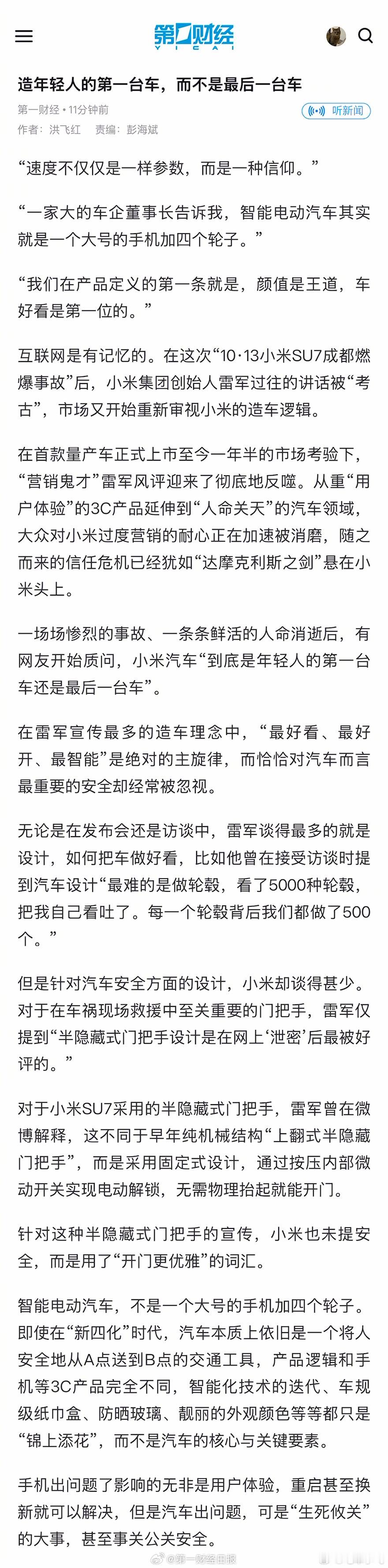 第一财经太勇了,连续几天发了好几篇文章抨击小米su7车门门锁。
