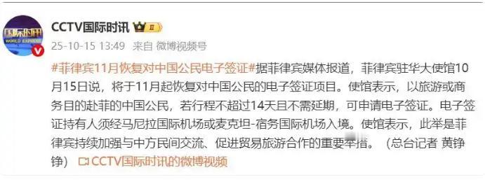 10月15日,菲律宾驻华大使馆宣布,11月起恢复对中国公民的电子签证项目。以旅游