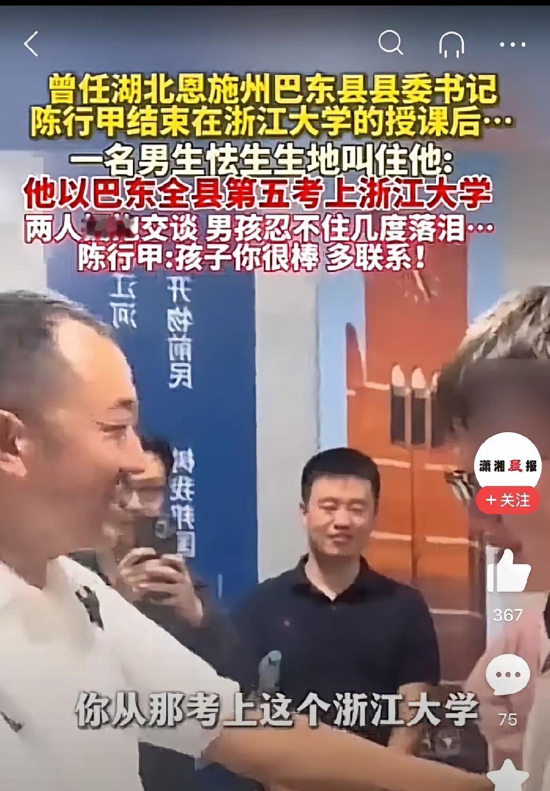 “浙大走廊的一声呼唤,藏着最动人的为官底色!” 当巴东学子向东升怯生生喊出“陈书记”,那个扳倒87名贪官的铁汉,瞬间卸下所有锋芒,眼里的狂喜比任何政绩都更打动人。 这不是简单的偶遇,是教育公平的种子结出的果——陈行甲当年在巴东深耕教育的坚守,如今化作1500公里外的温暖重逢。他紧抱学子的模样,让我们看清:真正的好官从不是追名逐利,而是把百姓的孩子当成自己的牵挂,把故土的未来揣进心里。 比起光鲜的头衔,这种跨越时空的悲悯与坚守才是最珍贵的。你觉得这份“为官情怀”最戳人的地方是什么?