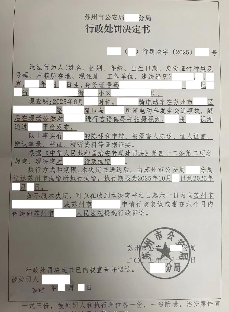 “我听交警的”事件的《处罚决定书》已作出! 2025年8月4日,在苏州市发生一起电动车碰撞事故,女子事发后歪曲事实、公然侮辱,并拍摄上传视频进行广泛传播,致男子遭受名誉、肖像侵害与隐私泄露。 目前,女子已被执行行政拘留。 网友:小伙子牛逼,思路清晰不上套,固定证据起诉小仙女。这种处理方式多一点,以后这类小仙女就不敢张口就来诬陷人家了。也为苏州当地的执法部门点赞,为他们给出的处理结果点赞! 特别好奇,苏州的这么快处理结果出来了,那个搞了很长时间的“地铁被冤枉偷拍”的案子怎么现在都没有结果?