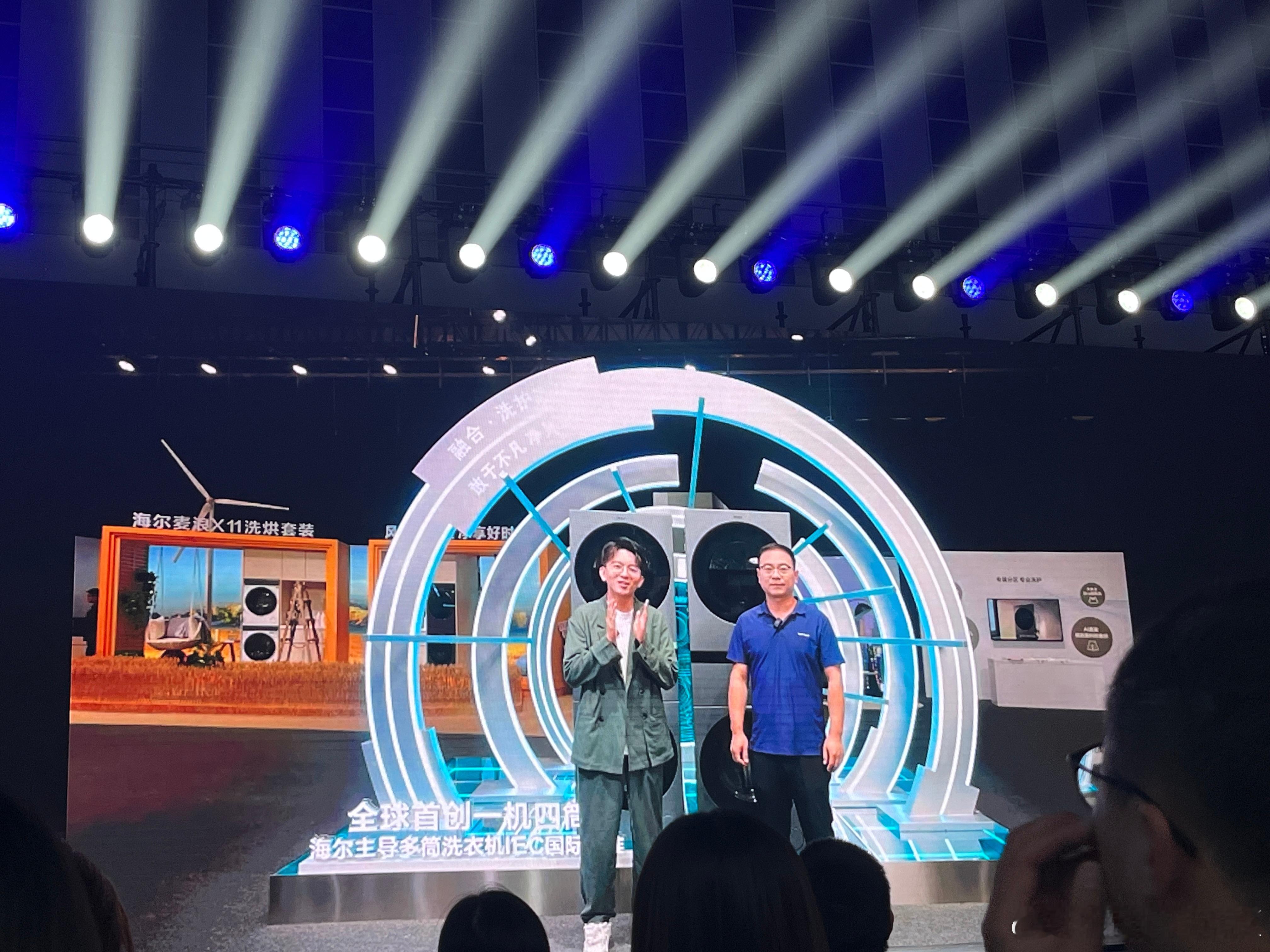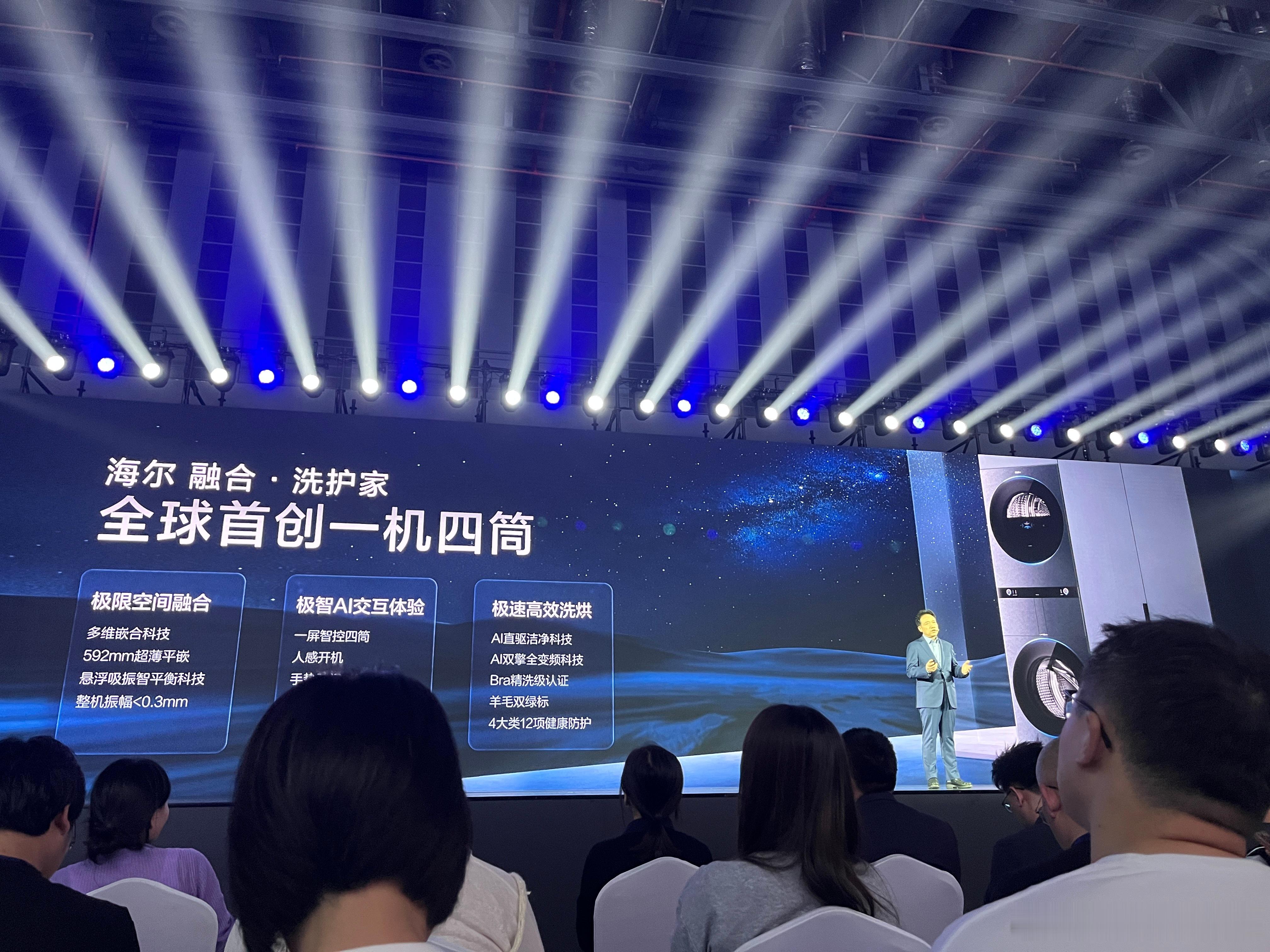 海尔新推出的融合洗衣机,全球首创一机四筒,分别用来洗衣服、烘干、洗内衣、洗袜子,做到了全家健康,一机搞定。消费者完全不用担心洗衣机筒越多操作是不是越复杂,这台洗衣机有极致AI交互体验,智慧人体感应;极限空间融合,首创三腔智能自清洁,无需手动清洁自由切换;极速高效洗烘,为全家衣物提供专属呵护。