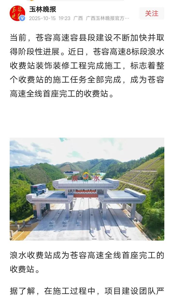 飞速发展,玉林容县应该是广西在建交通项目最多的县城,第一正在建设的梧州苍梧至容县的苍容高速将于今年底建成通车,目前沥青摊铺基本完成即将开始标志标牌等安装工作,浪水收费站也已装修完毕,第二正在建设贵港平南至容县全长约87公里的平容高速,2026年建成通车后容县开车来往平南的时间将缩短至1小时以内,第三正在建设的玉林至岑溪时速350公里的玉岑高铁,2026年建成开通运营后容县南站坐高铁来往南宁只需1小时左右,未来深南高铁全线建成后容县坐高铁来往珠三角各城市只需1至2小时,第四G80广昆高速玉林至岑溪段正在进行水泥路面改沥青路面作业,预计2026年1月31日可以全线完成,届时春节期间广州和云浮等地开车来往玉林和南宁将更加顺畅,在未来几年随着容县的几个交通大项目陆续建成,容县的交通将变得四通八达。