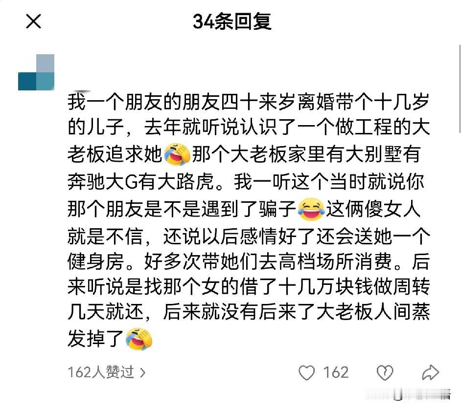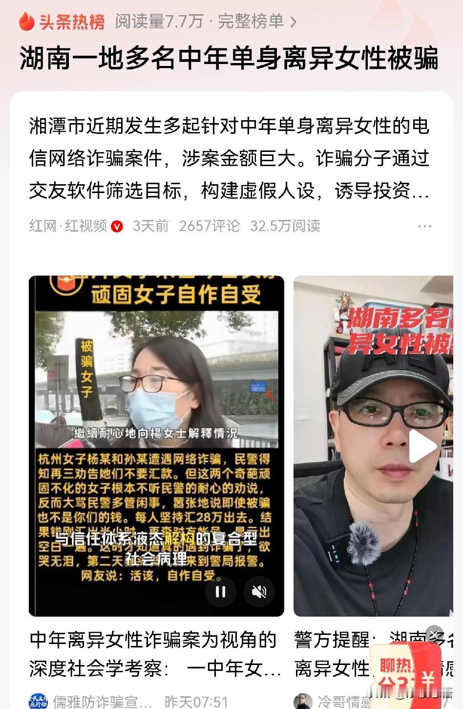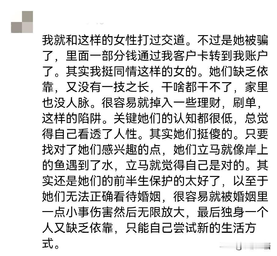 看到这种新闻,我忍不住想骂醒那些中年少女。中年单身或离异女性被骗的,简直就是长了年龄,没长心智。 那个穿的人模人样,微信朋友圈免费秀秀肌肉,每天给你点儿免费的温暖(微信问候),约你出去玩几次,你就天真的以为遇到真爱了? 还拿自己钱给男人花,简直了! 我告诉你,女人就是要小气、要藏富。 你做不到让男人为你花钱,那你起码也不要跪舔着给男人花钱。 中年单身、或者离异,有点儿钱就好好存着吧,或者多花在自己身上,美容、健身、学一门技能、报个MBA班都可以。 实在不行,学习炒股也比被骗强。 千万别去幻想用金钱救赎爱情,救赎你以为的真命天子。 正缘都是很顺利的,两个人在一起平淡且幸福的。 那种太热情、或者动不动玩消失、喊你投钱给他的,都不是正缘。 所以,中年少女们,认清现实,立马止损。 一个很简单的道理,你年轻漂亮的时候,都没有遇到真爱。 人到中年还就遇到真爱了,还玩什么all in。 不是所有女人都是刘晓庆哦,人家有名气、有人脉、有金钱。 你作为一个普通人,有啥? 爱情这玩意,中年后就是奢侈品,有了就珍惜,没有要学会自洽。 别被骗子钻了空子。 网上骗局 女孩被骗 大龄青年被骗案