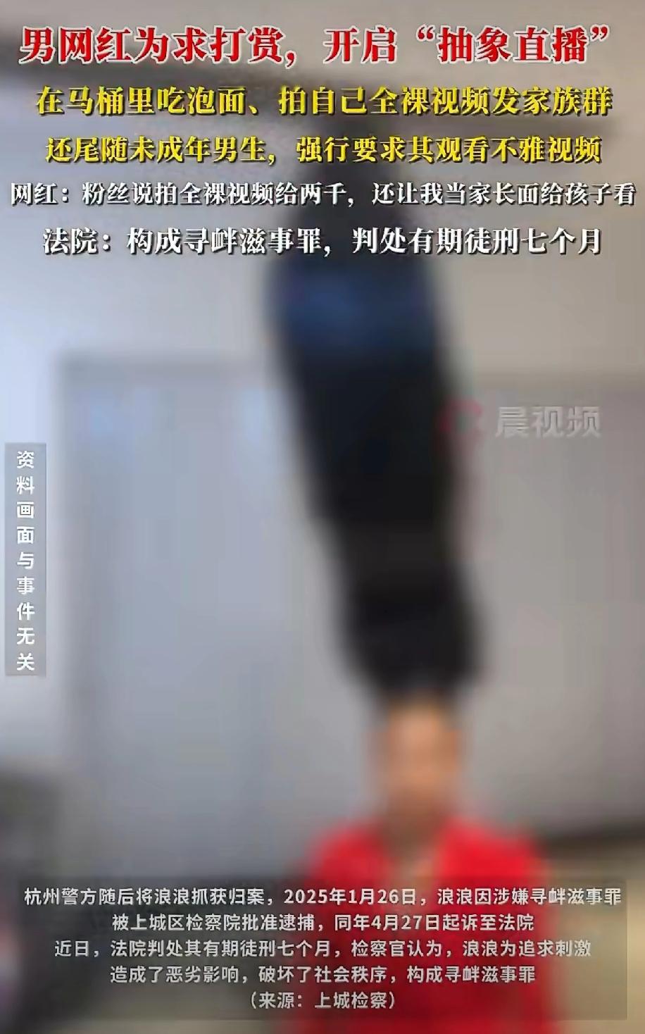 男网红“浪浪”因在直播期间拍摄并传播不雅视频,还多次在公共场所强行拦截路人、尾随未成年人播放该视频,被法院以寻衅滋事罪判处有期徒刑七个月。 法院判决指出,浪浪为博取流量和打赏,肆意突破法律底线,损害社会公序良俗,其行为已构成寻衅滋事罪,依法应予惩处。 事情并不复杂,却足够离谱——男网红“浪浪”为了直播间那点赞和打赏,把“抽象”玩成了“下流”: 1. 拍全裸视频先往自己家族群里扔,被踢出群后仍不收手; 2. 夜里跑到西湖边,举着手机拦路强行让路人看不雅片段,连未成年男生都不放过,尾随堵路硬塞镜头; 3. 弹幕还在拱火“当家长面给孩子看”,直到有人报警才慌忙下播。 警方到场、固定证据,不到48小时完成抓捕。检察院认定:随意追逐、拦截他人并强制传播淫秽画面,造成公共场所秩序混乱,已构成寻衅滋事罪。法院一锤定音——有期徒刑七个月。 直播可以“抽象”,但法律从不抽象。流量再高,也遮不住底线掉了一地的事实;刑期再短,也足够给仍想靠“无下限”博眼球的人提个醒:镜头对面不是法外之地,下次再越线,等来的就不是礼物,而是手铐。 (来源:潇湘晨报)