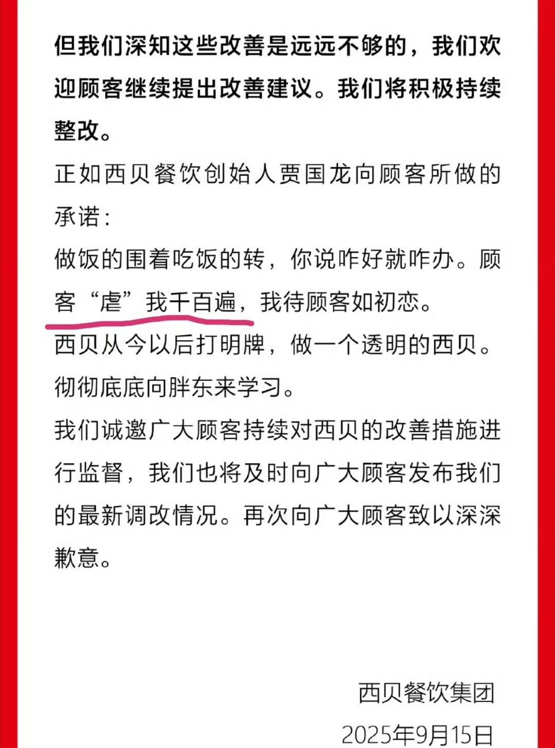 今天西贝那个道歉,其实发了两遍。第一遍删了,再重发的。 我当时真的完全一点都没