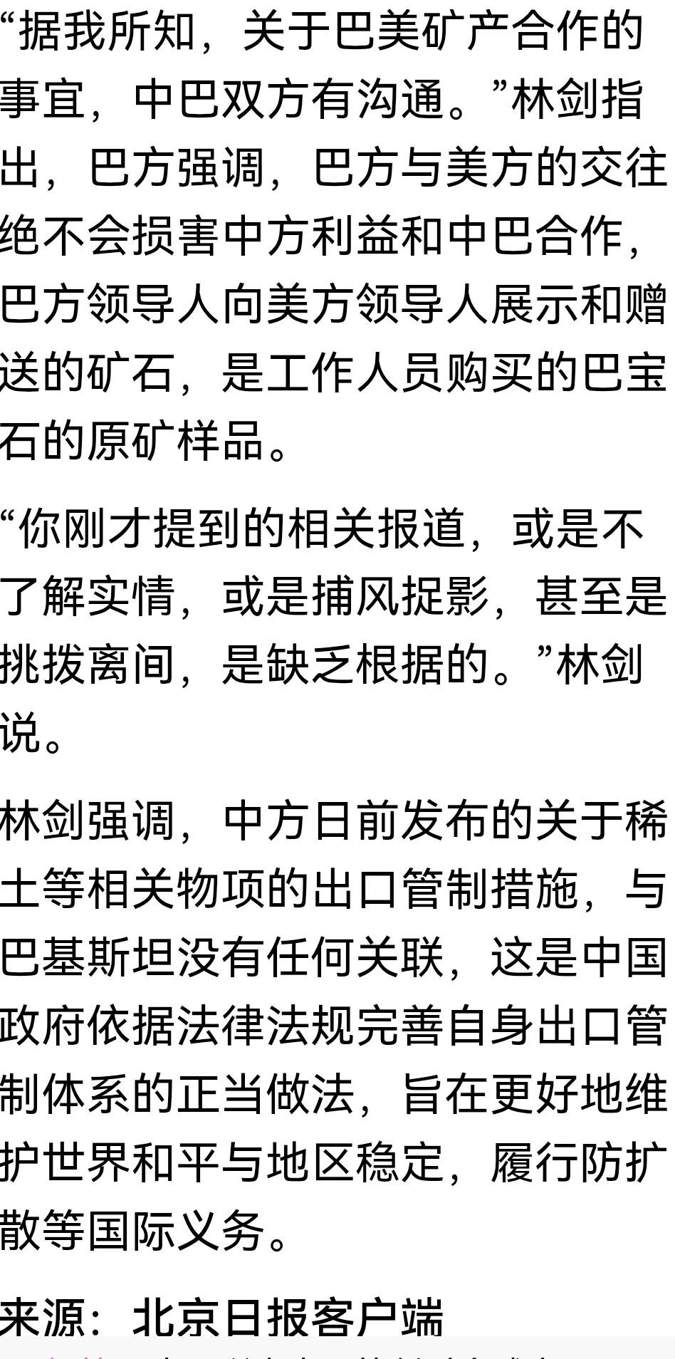 关于巴铁向美国出售稀土一案,终于有了官方裁决,谣言可以休矣! 这些天,关于巴铁向美国出售稀土的事,炒的沸沸扬扬,各种流言蜚语甚嚣尘上。什么巴铁不铁了,什么巴铁背叛中国了等等。这里面有一些人可能并不知情,只是随着别人说骂,但肯定也会有一部分人是居心叵测,不乐见中巴友好的。 今天终于有权威答案了。我们的发言人说:中巴两国铁杆友谊历久弥坚,一直保持高度的战略互信。关于巴美矿产合作一事,中巴事前早有沟通。中国所采取的关于稀土的相关措施也与巴美矿产合作毫无关系。 这下大家放心了吧,千万不要被那些别有用心的人带偏了呀!
