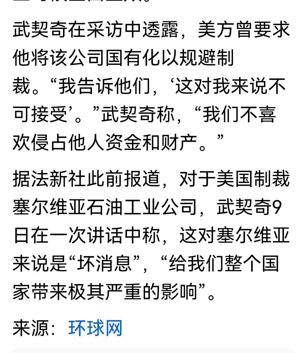 美国这次出丑了,被武契奇把底裤都扒掉了! 美国就像一个长舌妇,到处搬弄是非,挑拨别国的关系。认为别人都是傻子,都会听他的摆布。这次碰见明白人算是出了丑了! 美国装好人给武契奇出主意,让塞尔维亚将俄控石油公司国有化,以规避美国对该公司的制裁。这明摆着就是破坏塞俄关系,黄鼠狼给鸡拜年,没安好心啊!结果立即被怼了回去,武契奇说:我们不喜欢侵占他人的资金和财产。哈哈,其实这明摆着就是说我们不会像你们一样喜欢侵占别人的资金和财产嘛,简直把美国的底裤都扒掉了。 美国现在已经没有一点大国风范了,把自己的大国形象都糟蹋没了,简直是贻笑天下!