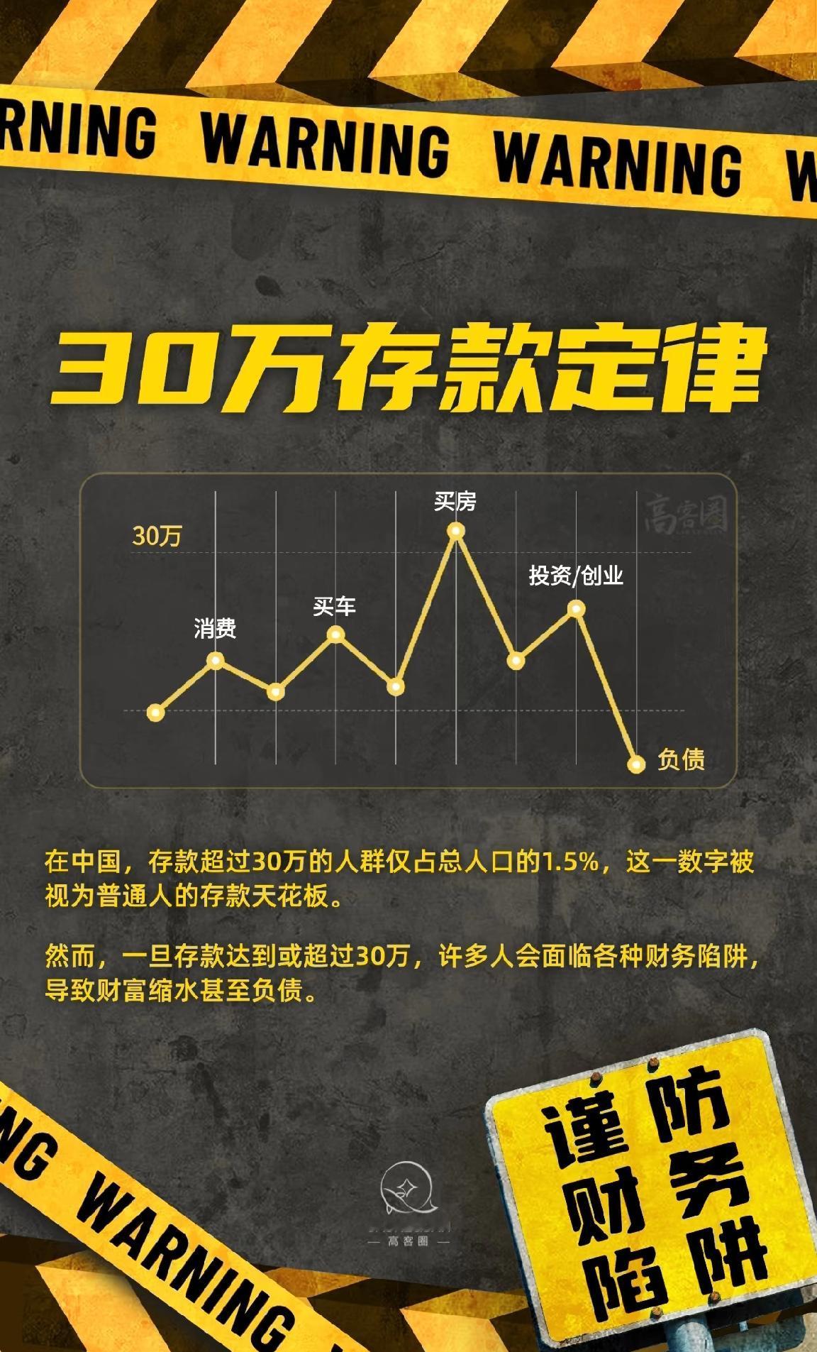 最近一个词很🔥,【30万存款定律】❗️ 赚钱不易,守财更难! 中年后,你命里有多少钱, 主要取决于4个人!你信不信这个邪❗️ “30万存款定律是说,当个人或家庭存款达到30万的时候,人会心里膨胀,外部诱惑等各种原因,挥霍钱财,甚至一夜返贫!” 央行显示人均存款已经已经达到10万。但,存款超过30万的人群仅限占总人口的1.5! 你遇到的贵人,跟你亲近的朋友,你的伴侣,你自己! 这4个人的认知和影响力, 决定你财富积累的多少! 他们可能是你的助力, 也可能会是你的阻力! 贵人万提携你,收入翻倍,反之无效努力! 朋友影响你,积极理财财富增多,反之挥霍! 伴侣花钱观念统一,财富管理得当,会积累财富!反之,经济混乱,矛盾多,事业也受影响! 我们自己是根本,能否守住财富, 就要约束欲望,守住底线! 你存到钱了吗?