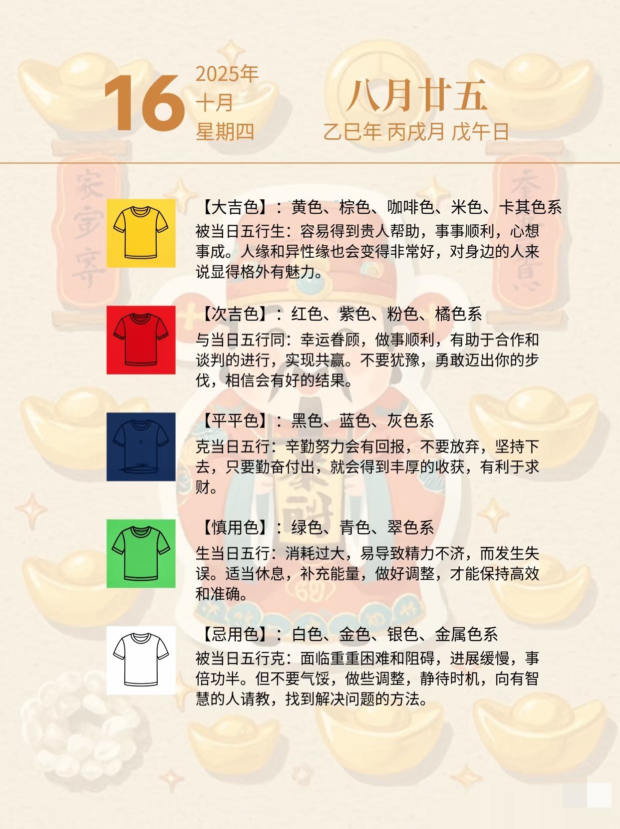 10月14—16号的穿衣指南提前来啦![舔屏] 希望对大家出门办事有帮助! 小伙伴们问:“五行穿衣是上衣还是全身"❓️ 我在这再给小伙伴们一些穿搭小建议,五色起源于五行学说, 以五行与颜色相对应, 改善生活中相关方面的磁场, 平衡五行,会让生活顺畅和快乐。 外套尽可能回避当日不宜的颜色就行! 大面积的选择当日好运色[爱慕] ㊗大家好运连连[祈祷]