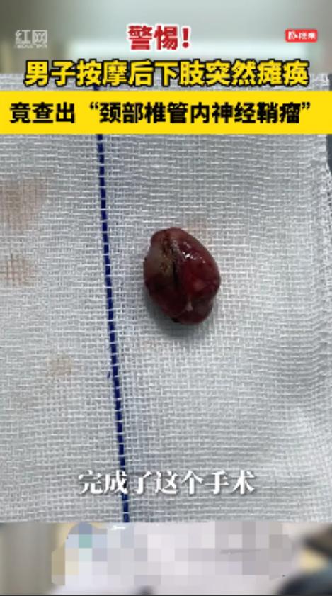 “悲剧还是发生了!”这句话最近在湖南宁乡的朋友圈里传得沸沸扬扬。 一名30多岁的男子,本想着去放松放松,结果一次普通的按摩,竟让他从一个大步流星的壮年人,变成了下肢瘫痪的病人。 信息来源:《男子按摩后下肢突然瘫痪 医生提醒:颈椎不好别胡乱按摩,严重可危及生命》红网 有时候,悲剧并不是突如其来的,而是你一念之间做出的“放松决定”。 湖南宁乡的一个男子,本想去按摩店舒缓一下颈椎疼痛,结果这一趟“放松之旅”,险些让他终身瘫痪。 这名男子三十出头,是个典型的办公室打工人。每天对着电脑十几个小时,肩颈酸胀已经成了家常便饭。 平时他也不太在意,想着“就是颈椎病,按一按就好了”。 最近那段时间,他的脖子越来越紧,低头就酸、抬头就痛,甚至晚上睡觉一翻身都“咯噔”作响。 他心想:“不能再拖了,得去放松放松。” 于是,在朋友的推荐下,他找了一家口碑还不错的按摩店。门口的广告牌上写着:“专业颈椎调理,舒筋活络,立竿见影。” 他看着挺正规,就进去了。 店里灯光柔和,空气中飘着一股淡淡的药油味。技师是个四十多岁的男人,笑得特别热情。 “兄弟,你这颈椎一看就不行啊,估计压着神经了。我这手法专治这个,包你按完轻松。” 男子听得挺舒服,没多想,就趴在按摩床上。 技师先是用力推拿,再来几下旋转动作。只听到“咔——”的一声脆响,男子只觉得脖子一麻,一股电流顺着脊柱往下窜,腿一下子发麻。 “师傅,我腿有点麻。” “正常,说明通经络了。” 技师边说边继续用力按。 男子心里虽然有点慌,但想着人家是“专业的”,于是忍着不适硬是按完了全程。 等他起身时,腿软得厉害,脚底发虚,差点摔倒。 技师笑着说:“回家休息一下就好,明天准舒服!” 男子半信半疑地走了出去,谁也没想到,这一句“明天就好”,成了噩梦的开始。 第二天一早,男子起床准备上厕所。 他一蹲下去,顺利得很,可当他要站起来时,却发现腿不听使唤。 他试着撑着洗手台站起来,腿一点力气都没有。慌乱中,他叫来了妻子:“我……我站不起来了。” 妻子以为他开玩笑,但看到他脸色惨白、满头冷汗,顿时慌了。两人赶紧打车去了医院。 医生连忙安排检查,问了几个关键问题: “你昨天有没有摔倒?” “有没有按摩或推拿?” 男子点点头,说自己昨天按了颈椎。 医生脸色立刻变了:“赶紧做核磁!” 几个小时后,真相终于揭开—— 男子颈椎椎管内长了一个肿瘤! 而那次按摩,正好“按”在肿瘤上,造成神经受压,直接导致下肢瘫痪。 医生当场告知家属:“再拖一会儿,可能就永久瘫痪了。” 那一夜,手术室的灯一直亮到凌晨。医生小心翼翼地为他切除肿瘤,整整七个小时,家属守在外面一刻也不敢合眼。 凌晨三点,医生推门出来:“手术成功,肿瘤切除了。” 家人当场流泪——他们知道,这一刀,挽回的不只是腿,更是整个家庭的希望。 术后前几天,男子仍然下肢无力。护士轻声问他:“能感觉到脚吗?” 他拼命集中精神,终于,脚趾微微动了动。 那一刻,他哭了——那不是疼,而是活着的实感。 经过几个月的康复,他终于能再次下地行走。虽然脚步还不稳,但他每走一步,心里都在感谢医生,也在后悔那天的冲动。 医生后来告诉他: “你这是幸运。肿瘤压迫脊髓神经的患者,一旦受到刺激,很可能终身瘫痪。” 其实,很多人都和他一样,哪里痛就想去按摩。 但有些疼痛不是“筋络不通”,而是身体在发出警告。 对此大家有什么想说的?欢迎在评论区留言讨论!