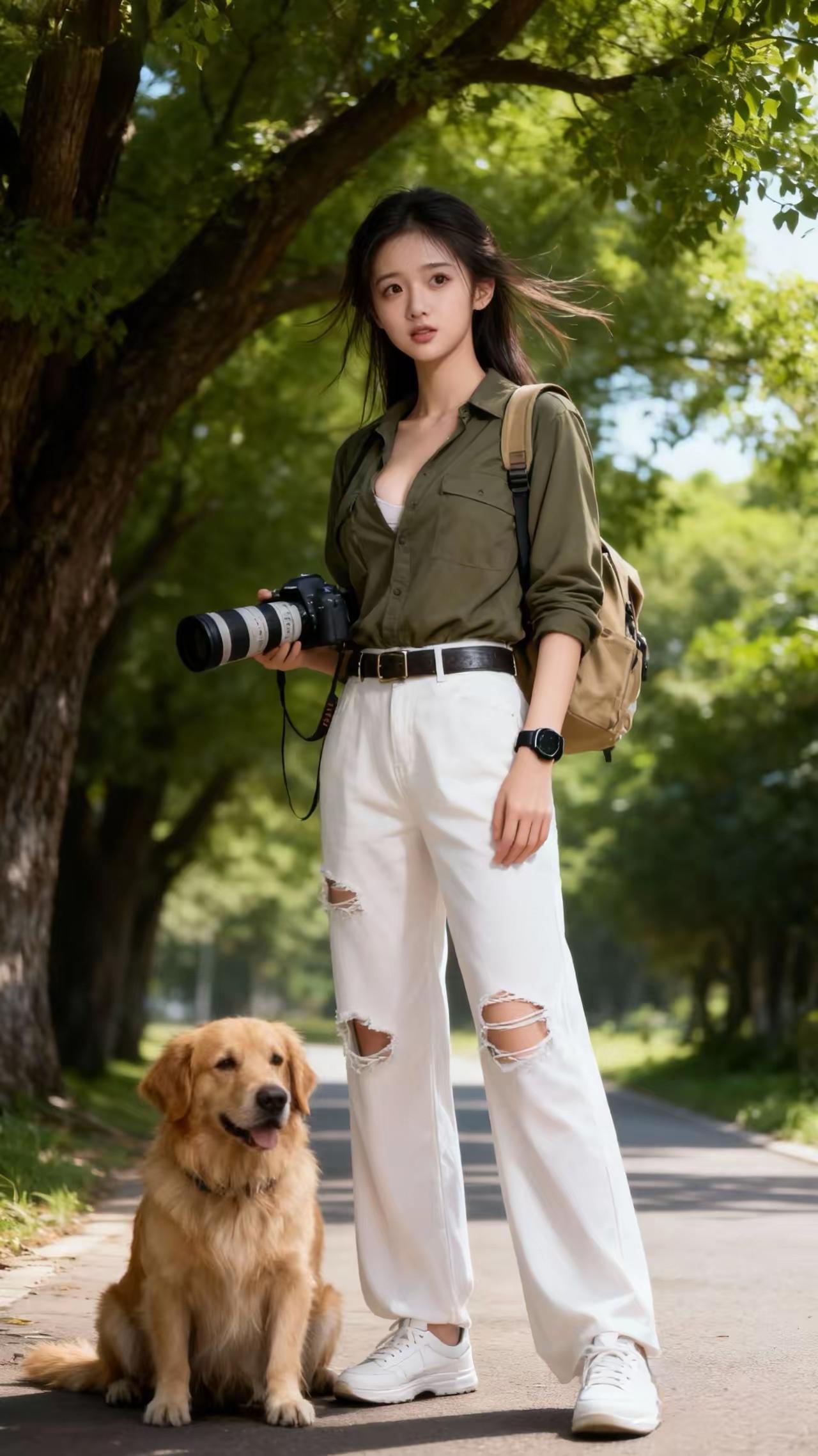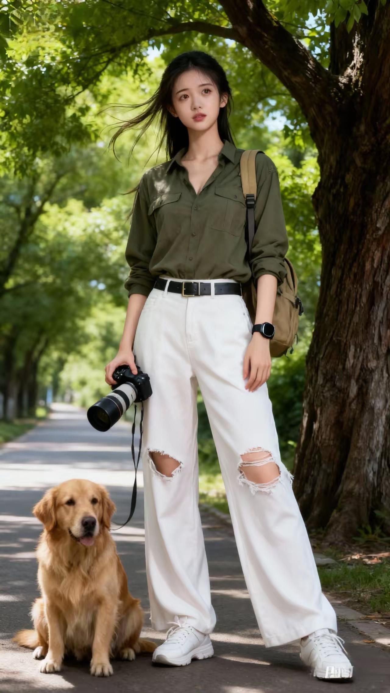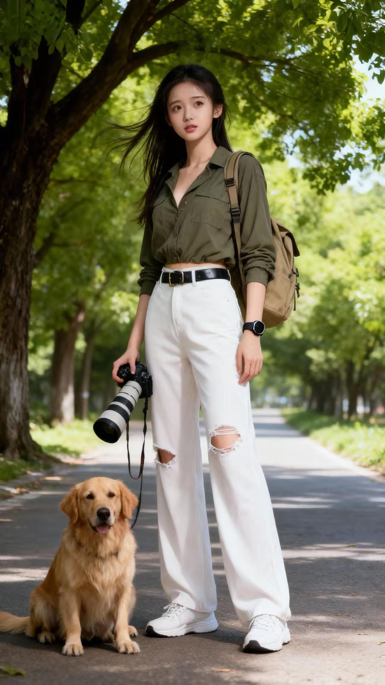 绿树掩映下,少女与犬相伴。