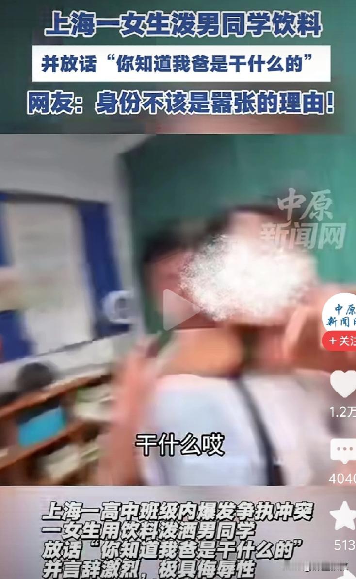 上海,一女生不仅高喊着我是高一的,随时来找我,并羞辱对方:“我一点不好惹,你一个大专生有什么资格跟我说话,你知道我爸是干什么的么?说完还拿饮料往男生身上泼。忍无可忍男生开始动手反击,随后被同学拉开。 上海这边,前段时间有个高中教室里的事,传得挺广,看完让人心里堵得慌,本来就是普通的课间,教室里还有同学在收拾书本、小声聊天,没成想突然就起了冲突,主角是一个女生和一个男生,那女生的态度简直嚣张得让人咋舌。 一开始女生就对着男生不依不饶,声音又大又冲,一边说还一边往男生跟前凑,嘴里还扬着嗓子放话:“我是高一的,你记好了,以后随时来找我!” 那架势完全是一副 “我不好惹” 的模样,周围几个同学听见动静,都停下手里的事看过来,可没人敢上前劝一句。 接着女生的话就更难听了,对着男生劈头盖脸地羞辱:“你一个大专生,有什么资格跟我说话?” 这话一出口周围一下子就静下来了,连之前小声的议论都没了。 可女生还没完,又抛出一句更让人心里发沉的话:“你知道我爸是干什么的么?” 说这话的时候,她眼神里带着一股子不屑,仿佛这句话就能把男生压得抬不起头。 没等男生回应,女生直接拿起桌上的饮料,有黄色的、还有黑色的,一瓶接一瓶地往男生脸上、身上泼,冰凉的饮料顺着男生的头发往下淌,衣服很快就湿了一大片,黏在身上看着都难受。 男生一开始还忍着,攥着拳头没动,可女生泼了好几瓶,嘴里的羞辱也没停,他脸上的表情越来越难看,显然是快忍不住了。 周围的同学就这么看着,有人低下头假装没看见,有人还在偷偷用手机拍,就是没人敢站出来拦一下,连门边好像有老师经过,瞅了一眼里面的情况,也没进来就那么走了。 整个教室静得奇怪,只有女生的声音和饮料瓶碰撞的声音,那股子压抑劲儿,隔着屏幕都能感觉到,终于男生忍到了头,情绪一下子爆发了,伸手就朝着女生冲过去,甚至有了锁喉的动作。 看得出来他是真被逼急了,可就在这时候,之前一直没动静的几个同学,包括后来网友们反复提到的那个戴眼镜的男生,一下子都围了上来,使劲儿把男生往旁边拉,有人还按着他的胳膊,生怕他再往前冲。 可有意思的是,没人去拦那个还在气头上的女生,她就站在一边看着男生被拉开,脸上甚至还有点得意,这场景明眼人一看就明白,哪是正经劝架啊,分明就是 “拉偏架”,之前女生欺负人的时候没人管,男生一反击,倒有人出来 “维持秩序” 了。 后来这事听说是以 “私下协商和解” 收场,可网上的议论一点没少,反而越来越多,有人说男生太冲动不该动手,但更多人觉得憋屈,替那个男生抱不平,被人羞辱又泼饮料换谁能一直忍? 大家的疑问也一堆堆的,那个女生嘴里说的 “我爸是干什么的”,到底她爸是啥身份,能让她在学校里这么肆无忌惮?还有为啥网上流传的视频里,施暴的女生脸上打了马赛克,被欺负的男生却露着脸?这算啥事儿啊,难道因为女生家里可能有背景就能这么双标? 其实大家追问的根本不是什么八卦,是想弄明白难道有权力或者背景,就能明目张胆地欺负人,最后还能悄无声儿地把事儿压下去? 这可不是简单的校园冲突了,更让人寒心的是周围人的态度,老师不管同学沉默,只有在受害者反击时,才有人跳出来 “拉偏架”。 大家在意的不是这一件事的结果,是想看到个公平,不管家里是什么情况,做错了就是做错了,不能因为背景特殊,就可以欺负人还不用担责,要是连校园里都讲不通这个理,那才是真的让人担心。 (信息来源:中原新闻网2025年10月15日——上海一女生泼男同学饮料 并放话“你知道我爸是干什么的”)