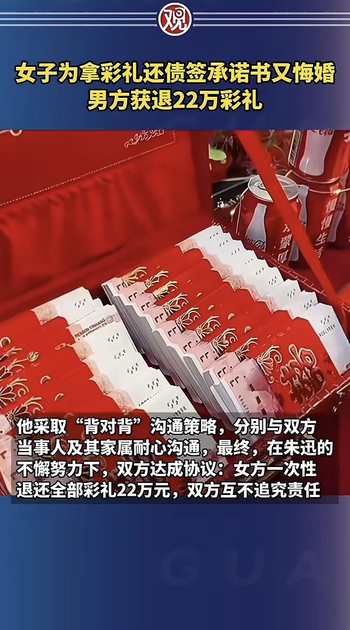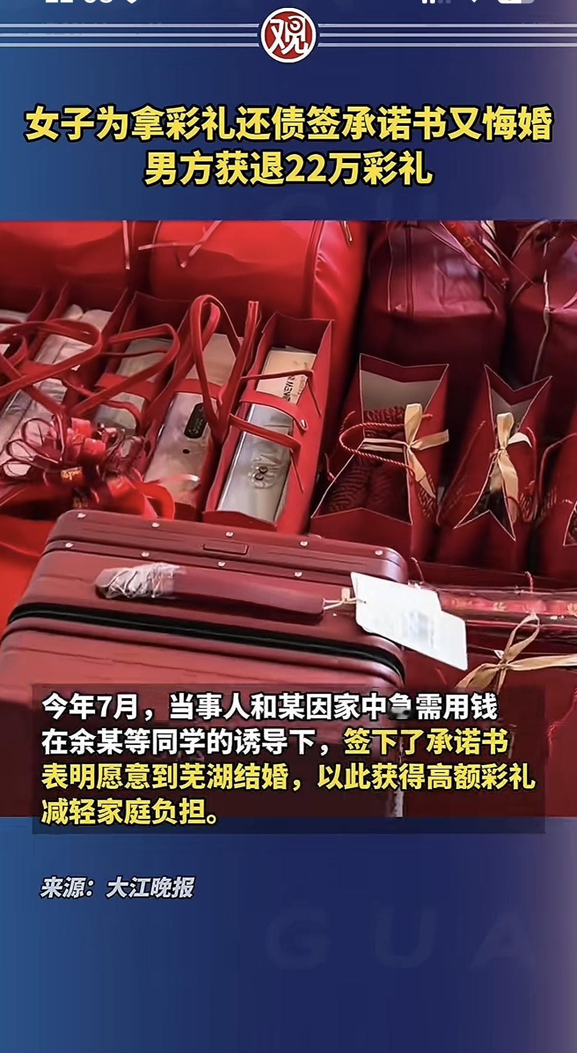 安徽芜湖,女子家中负债累累,为解燃眉之急,她在同学的诱导下,和一男子签订结婚承诺书,一次性拿到了22万的彩礼。相处两个月后,女子觉得这不是她想要的爱情,于是提出悔婚。男子没有强求,同意退婚但要女子退还22万彩礼,不料却遭到女子拒绝。女子:彩礼用来给老家还债了,只有13万爱要不要。男子报警后,民警的处理让人竖起了大拇指。 今日,在派出所的接待室里,22 万元现金被缓缓移交,空气里没有交易成功的喜悦,只有一种沉甸甸的压抑 。 事情的源头,是学生小何心中挥之不去的家庭债务。每次与父母通话,电话那头的叹气声像石头般压在她心上,如何帮家里脱困成了她的心病。 同学小丽得知后,竟提出一个荒唐建议,找个愿意给彩礼的人结婚,先用这笔钱帮父母应急。被债务逼急的小何,竟觉得这是 “可行之策”。 没多久,小丽为小何牵线认识了小军。作为本地上班族,小军为人老实,一心想早点成家,对小何的第一印象也不错。 为了这份 “婚事”,他拿出多年积蓄,又向人借了一笔钱,凑够 22 万元彩礼,还签了结婚协议书,满心期待着婚后生活。 可接下来的两个月,22 万元成了两人唯一的 “联系”。小军主动关心、努力维系关系,小何却始终态度冷淡 ,她心里清楚,自己答应结婚,不过是为了那笔救急的钱,从未对小军动过心。 终于,小何直白地告诉小军:“我对你没感觉。”这句话彻底引爆矛盾。小军觉得自己的真心与积蓄全打了水漂,要求全额退还彩礼,小何却只愿退 13 万,称剩余的钱已寄给云南的父母。 小军意识到自己可能被欺骗,当即报警求助,民警介入后,先安抚小何情绪,再拿出《民法典》明确告知,未办理结婚登记手续,彩礼应当全额返还,她的行为甚至可能涉嫌借婚姻骗取财物。 法律的界定让此前模糊的 “情感赠与” 有了明确答案,最终小何将 22 万元全部退还给小军。事件曝光后,网友纷纷谴责小何的做法,认为这种把婚姻当交易的行为不仅违背道德,更触碰了法律底线。 信息来源 :观察者网