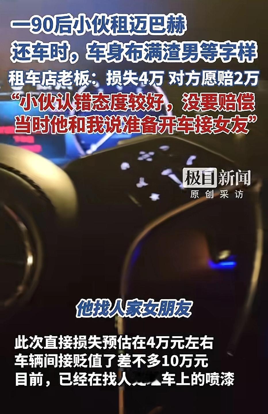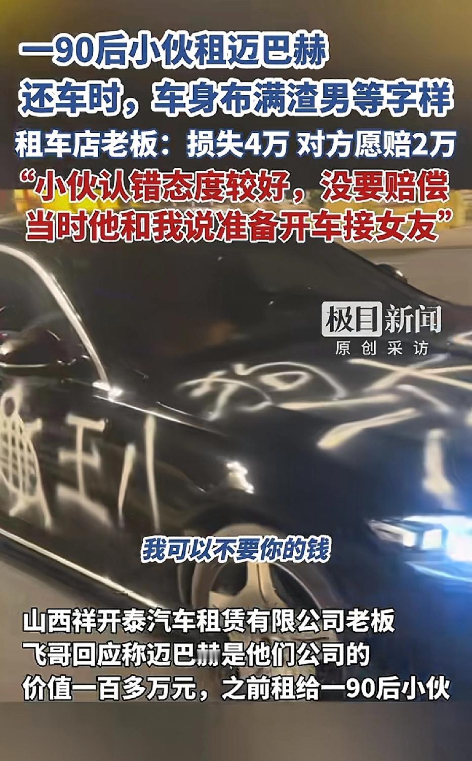 一位90后的山西太原小伙,满心欢喜地租了一辆迈巴赫去接女朋友。然而还车时,车身上被喷上了“渣男”“去死”“王八”等字样。 小伙还车时,满脸愧疚地向店老板赔罪。老板看到车被弄成这般模样,惊得目瞪口呆。 老板估计重新喷漆得花四万元,小伙赶忙四处找朋友借钱。 打完一圈电话后,他垂着头对老板说:“我眼下只能赔你两万,剩下的等我有钱了再补上,行不?” 老板见小伙双眼泛红,像是刚哭过,便问道:“女朋友没接到?” 小伙低下头,哽咽着说:“我一直以为她是我女朋友,没想到她是别人的。 然后她男朋友就把车弄成这样了。”说着,眼泪又夺眶而出。 老板拍了拍小伙的肩膀,安慰道:“遇人不淑不是你的错,就当是场误会。别哭了,喷漆的钱我不要了。以后看人可得擦亮眼睛。” 小伙因虚荣心作祟,为了面子去租车,才惹出这档子事儿。 不过,车被损坏后他没选择报警,这做法欠妥。 有时候一味忍气吞声,换来的可能是他人的嘲笑与得寸进尺。 人只有敢于捍卫自己的底线,维护应有的尊严与权益,才能活得硬气、行得端正。 来源:极目新闻