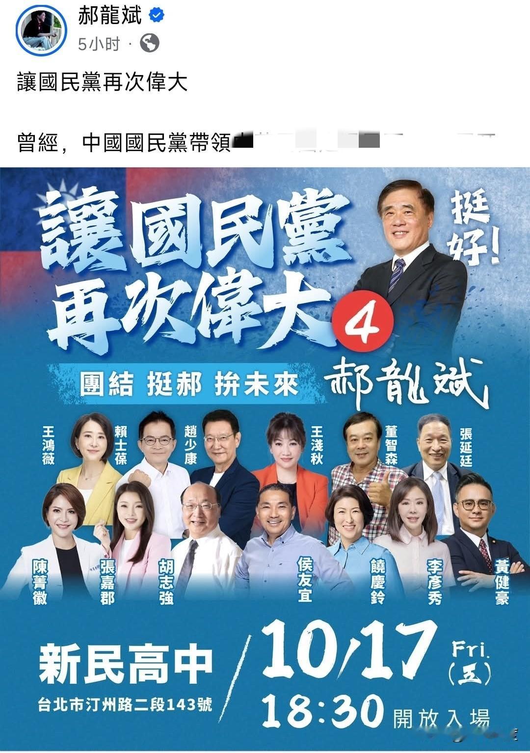 郑丽文今晚办,郝龙斌明晚办,两场选前造势活动台北较劲,从文宣可看出两人的格局和高度差! 郑丽文和郝龙斌今天均在脸书上贴出各自选前造势活动的公告。郑丽文将于今晚19:00在台北议会举办造势活动。而郝龙斌将于明日18:30在新民高中登场。 但两人的文宣风格截然不同,郑丽文发布的文宣只有一张图,配三个字。图片是一张郑丽文自己的图像,同时图上标注:下架民进党,拨乱反正,台北市各界力挺郑丽文晚会。这个文宣主打是下架民进党,让台湾回归正轨,虽然是党内选举,但完美避开了党内互打,目标直指政党轮替,立马就拉升了高度和格局。 另外,什么人会参加造势晚会,郑丽文没有透露一个名字,只说了三个字:今晚见。让外界充满了期待和想象。 再来看郝龙斌的文宣,先是写一大段长文,配的图是,上面是他的图像,下面P了一排人,数了下,有十三个人,每个人都把姓名加上,其中包括赵少康、侯友宜、王鸿薇还卢妈子黄健豪等共十三人。配的文字是让国民党再次伟大。 两个文宣拿来一比较,格局、高度高下立现。 首先从配文上来看,郑丽文简洁明了,今晚见,核心内涵体现在图片的标注中。而郝龙斌配了长文反而淡化了主题,冲淡公告效果。从图片上的标注来看,郑丽文是直指政党轮替,诉求下架民进党,这个应该是每个国民党员的最大共识,也是最大期待。而郝龙斌的让国民党再次伟大,这个气势就弱了许多,而且什么叫伟大?谁能说个清楚?诉求目标模糊。 另外与郑丽文不同的是,郑丽文未透露一个出场嘉宾,而郝龙斌P了一排人,这些人大概是明晚到场的人,但也许可能还掺杂着他自认为人家支持,但人家可能不支持的人。而且名单全曝光,大家一看不过如此,也就失去了想象力和吸引力。 所以相对来说郝龙斌的文宣过于老派陈旧,且高度不够,张力不足,效果有限! 那为什么说郝龙斌有可能P上他认为挺他的,但可能人家其实不挺他的人呢?这是因为郝龙斌今天就闹出一个天龙的乌龙。 郝龙斌今天在脸书上PO出了一张与王金平的合影,说王金平支持他,期勉他参选党主席。但王金平办公室很快发出声明表示,一、自郝龙斌宣布参选以后,两人并没有见面,这是一张老照片;二、王金平与郝龙斌一个月前有个会面,但当时没有涉及任何党主席选举话题,所以不存什么勉励期许之类的话。郝龙斌这老脸被打得啪啪的响啊。 两张不同的文宣图,看出两人的格局和高度,也看出背后操盘手水平。而郝龙斌这一套明显老派的作法,十有八九还是出自赵少康团队之手。