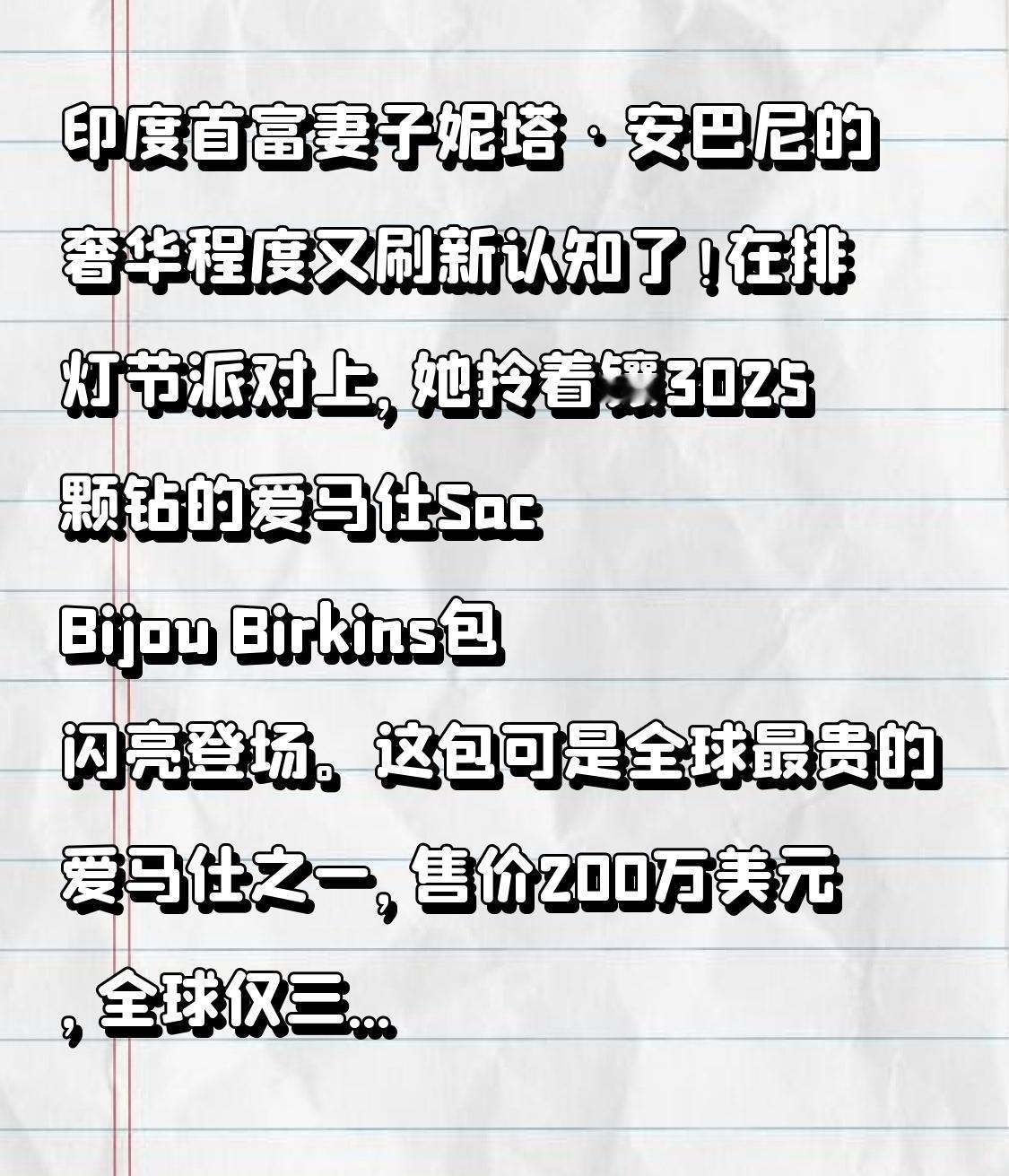 印度首富妻子妮塔·安巴尼的奢华程度又刷新认知了!在排灯节派对上,她拎着镶3025颗钻的爱马仕Sac Bijou Birkins包闪亮登场。这包可是全球最贵的爱马仕之一,售价200万美元,全球仅三只。18k白金打造,钻石总重111.09克拉,由爱马仕高级珠宝创意总监设计。 网友调侃她这是拎着一栋房出门。派对上她身着银色亮片纱丽,和小儿媳同框,相比之下小儿媳的打扮都显得朴实了。只能说,首富家的“壕”真让人惊叹,买钻石就像买白糖一样随意啊! 安巴尼 印度首富的女儿 印度首富珠宝