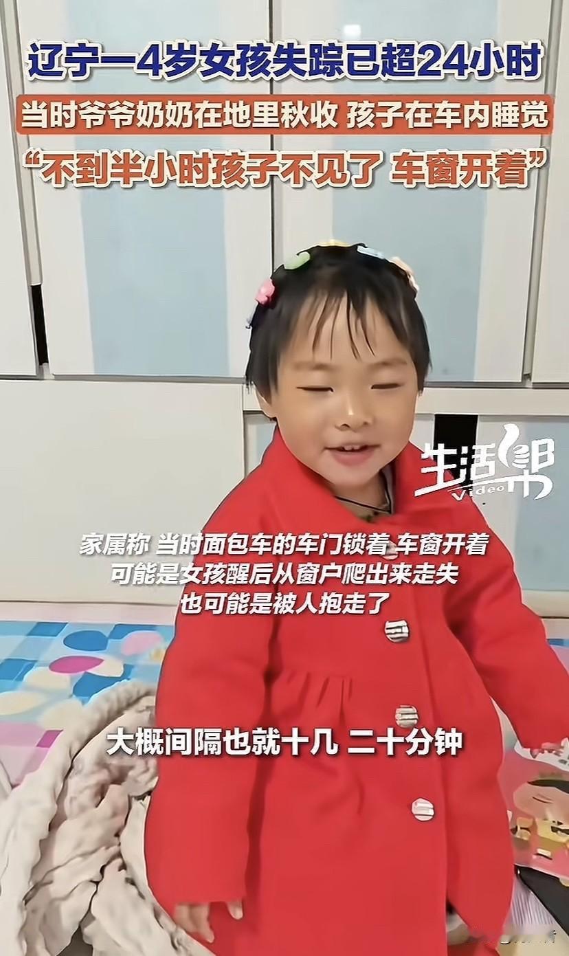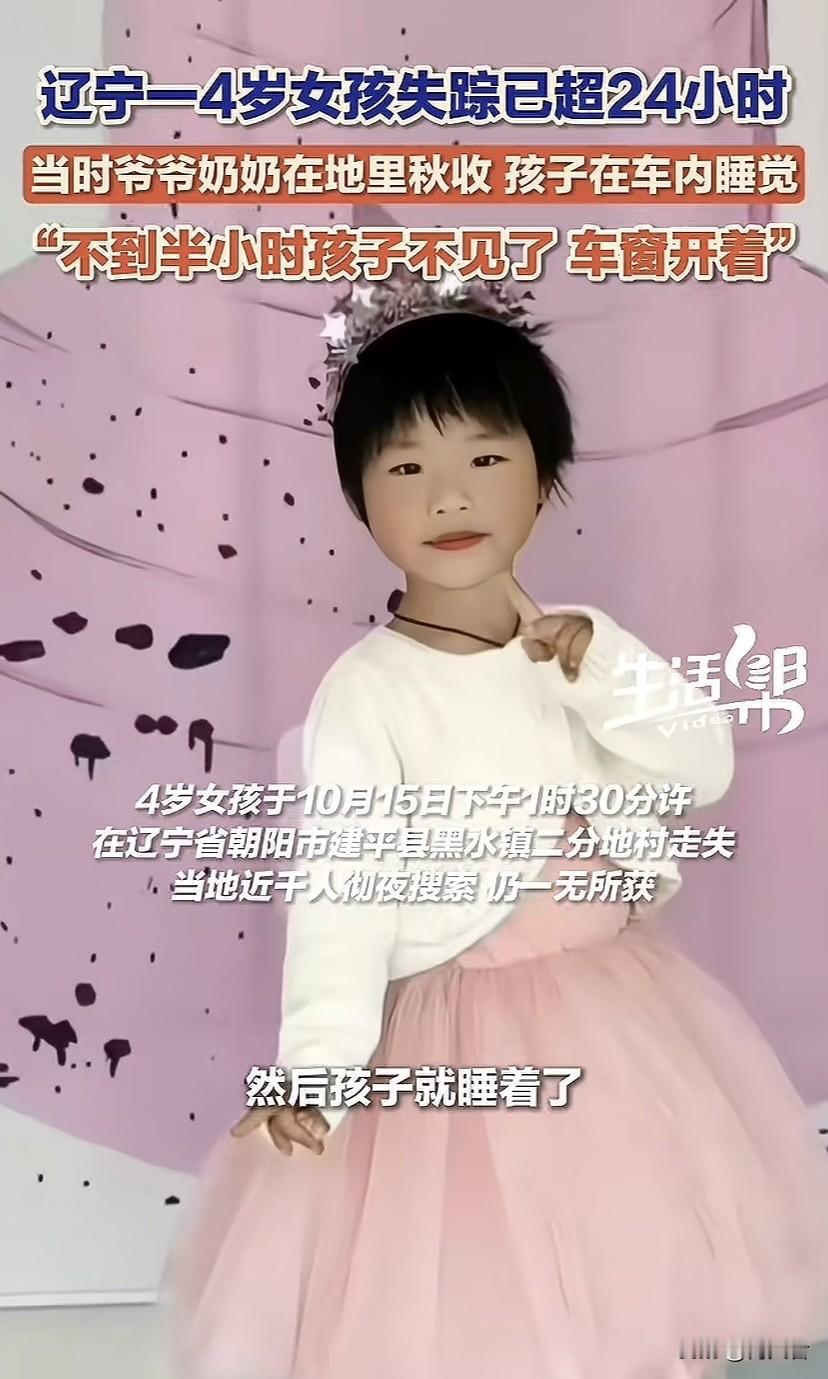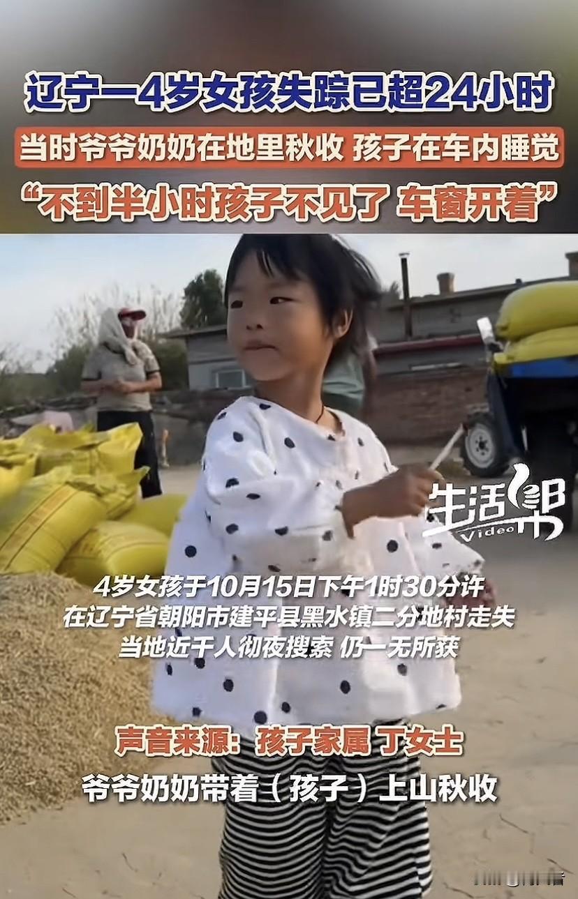 4岁的小女孩,爷爷奶奶放她在车内午睡时失踪超24小时。当时爷爷奶奶在地里秋收,把孩子锁在车里、开着窗,不到半小时孩子就没了踪影。孩子父母在外地工作,父亲赶回家加入寻找。大家在方圆两公里内搜索,警方、救援队都上了,还用了热成像仪,可还是没找到。孩子穿的红绿色衣服在平原很扎眼,咋就找不到呢?事发地在山上,虽说没大型野兽,但有鹰活动。希望大家都多留意,有线索赶紧联系,祈祷孩子能平安归来。