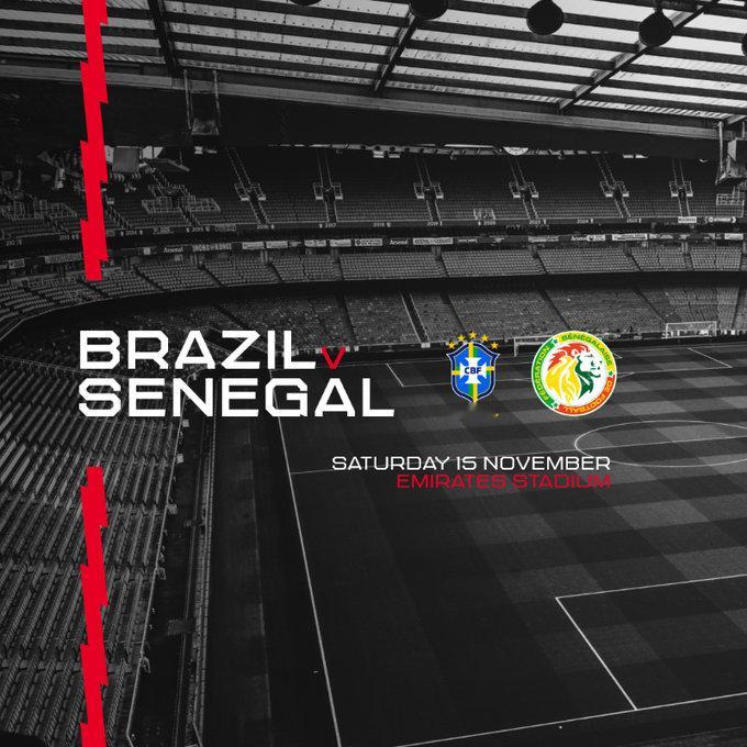 阿森纳官方消息:巴西队将于11月15日在酋长球场迎战塞内加尔队。