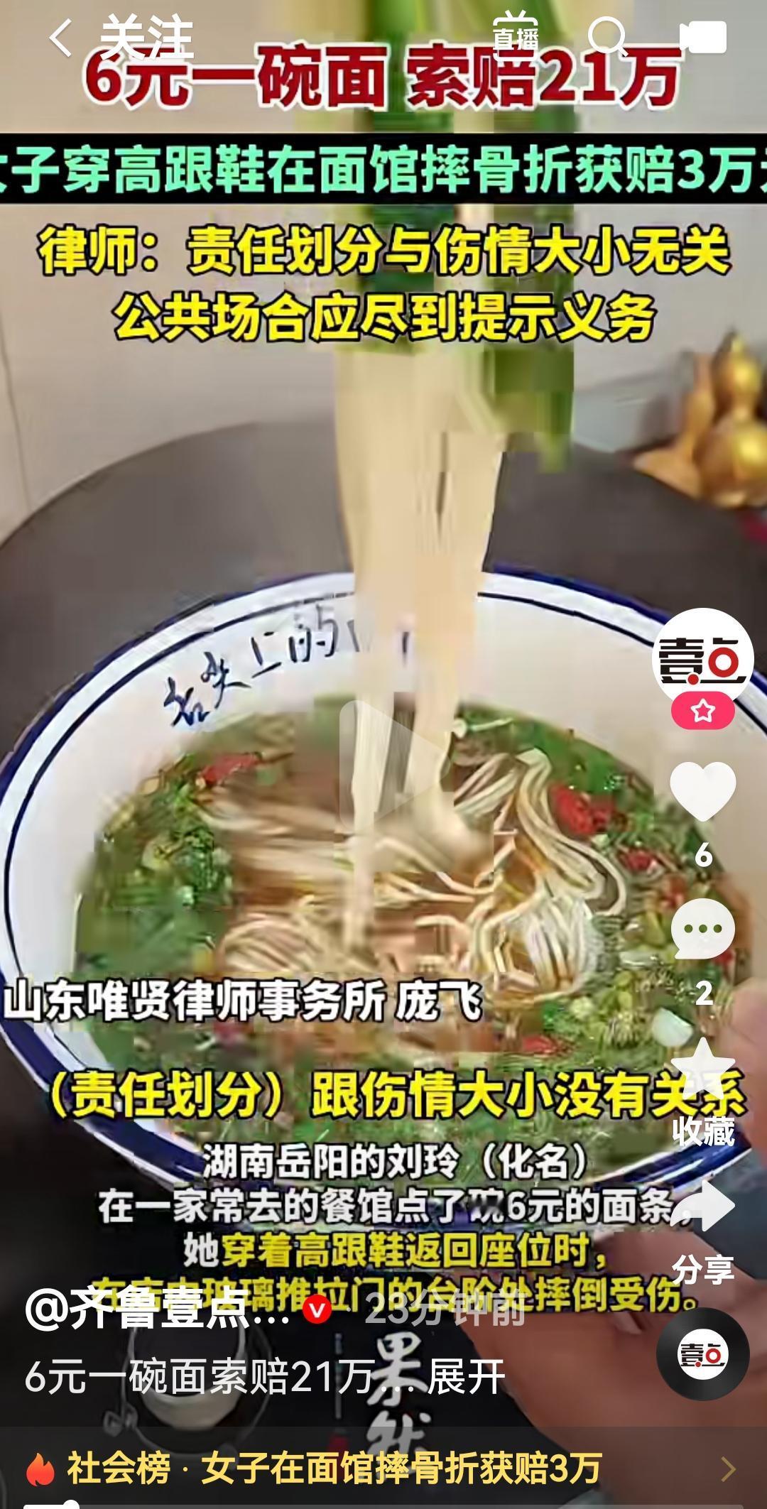 女子在餐馆吃了一碗6元的面因为在餐馆摔骨折餐馆索赔3万元 根据媒体报道,近日在湖