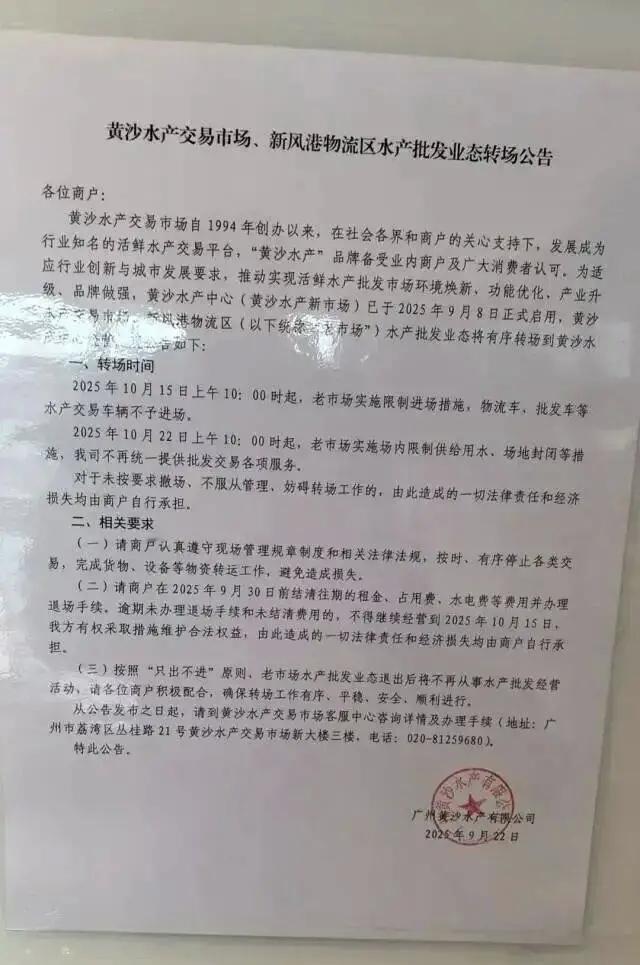 广州人注意!开了20多年的黄沙水产老市场,10月要变天了! 广州街坊常去的黄沙水产老市场,这次是真的要跟大家说“阶段性再见”了!刚看到市场贴的通知,心里还真有点不是滋味——10月15号起,老市场就不让批发的物流车、货车进场了,10月22号更是要断水、封场地,以后想买批发水产,只能去新市场。 其实新市场9月8号就开了,就在老市场西边,足足11万平方米,还是全国首个能溯源、能检测的智慧水产中心,听着就很靠谱。更方便的是,以前芳村的冰鲜市场也搬过去了,以后买活鲜、冰鲜不用跑两个地方,一趟就能搞定。 我还问了个在老市场开了20多年的老板,他说现在新旧市场都开着档,等9月20号左右就全搬去新的,还笃定说“新市场肯定能旺”。虽说老市场承载了不少回忆,但看着更规范、更方便的新市场,还是挺期待的,你们以后会去新市场买水产吗?