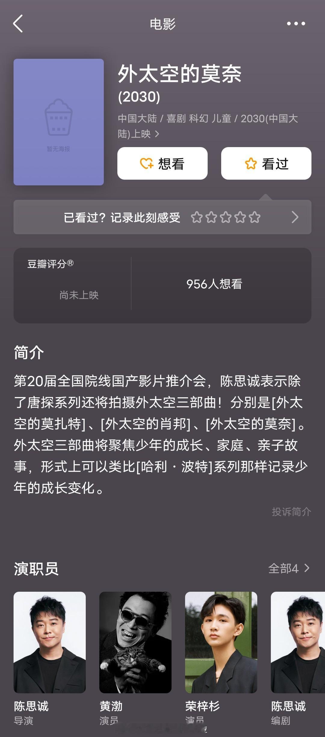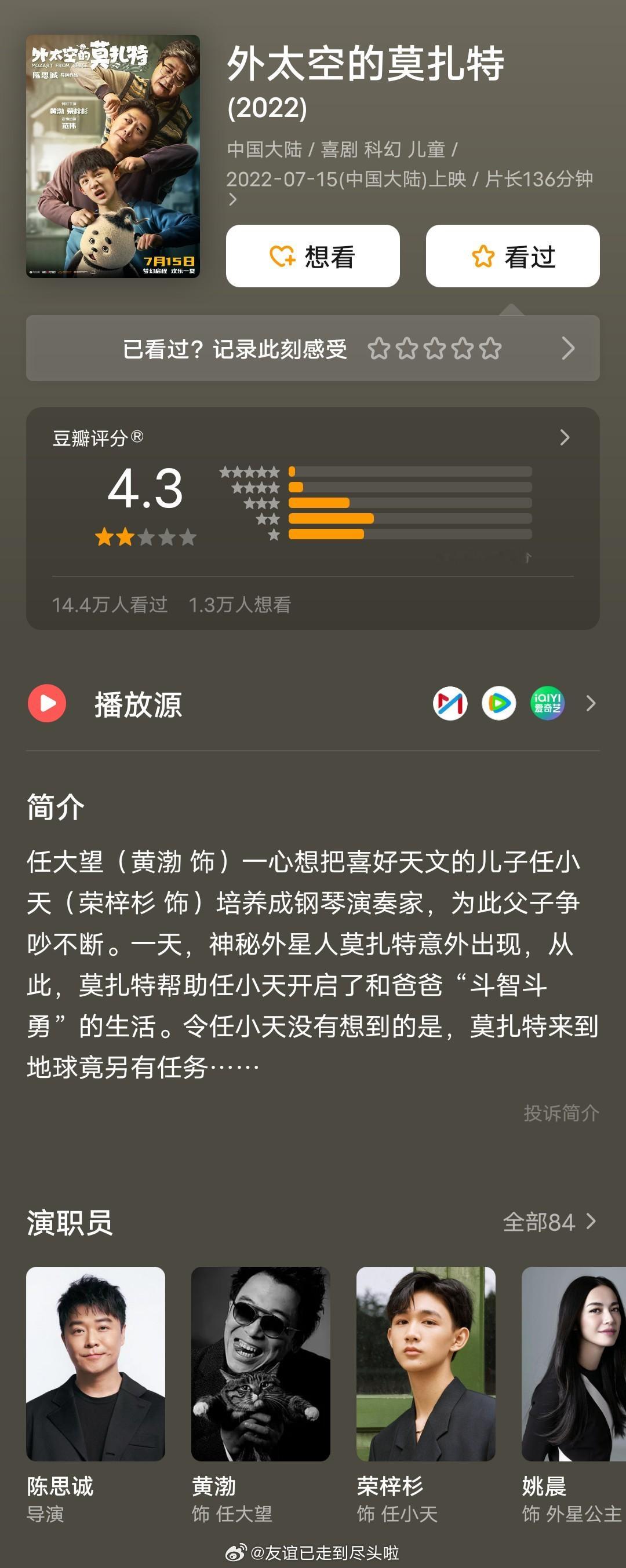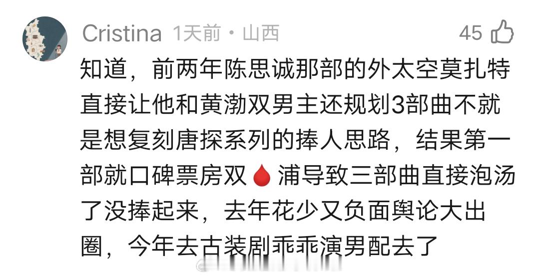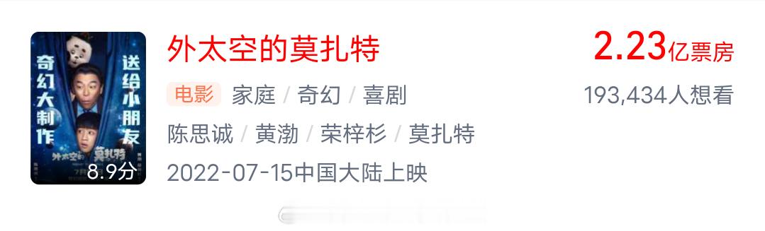 一上来就让荣梓杉和黄渤双男主,还规划了外太空三部曲,可惜第一部外太空的莫扎特票房2.23亿,豆瓣评分只有4.3,导致三部曲直接泡汤。