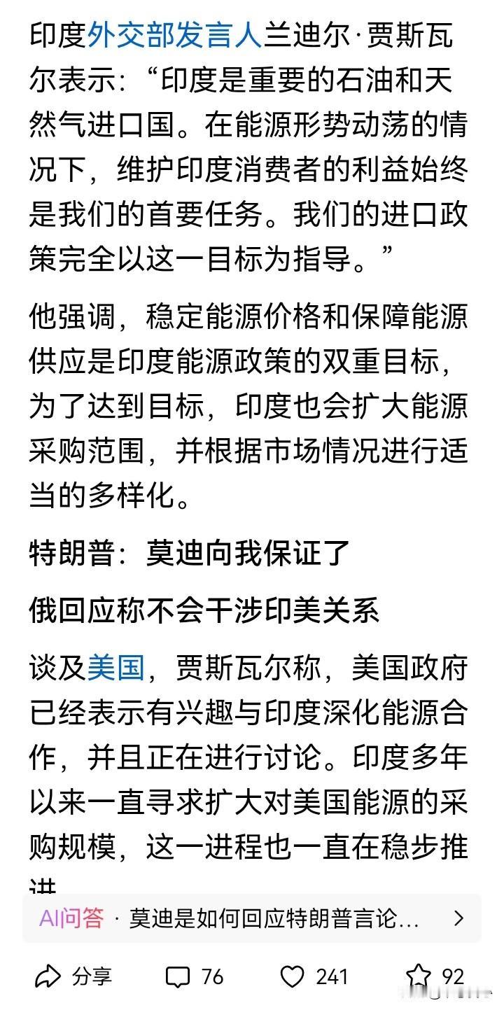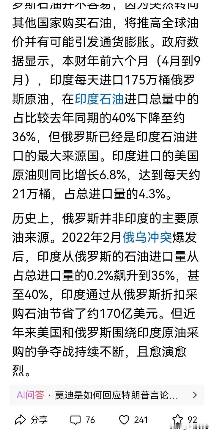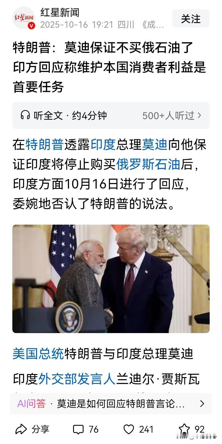 川普:你不是答应我不买大鹅的石油了吗? 莫:答应了。底下的人贪便宜,一直不给办。我想想方法,估计还要两年。 川普:两年?你意思我调停俄乌战争,两年还搞不定! 其实,欧美一直想封住大鹅石油的出口,没了钱,在战场上大鹅应该容易对付一些吧。 可是,貌似他们自己也还在买大鹅的石油呢。 至于印度,世界最多人口,同样是石油,中东虽然近,可是大鹅的折扣大啊,每年能省不少钱。所以,要不买大鹅的石油,有点难。 至于川普要求东大不买大鹅石油,东大:老子爱向谁买就向谁买!