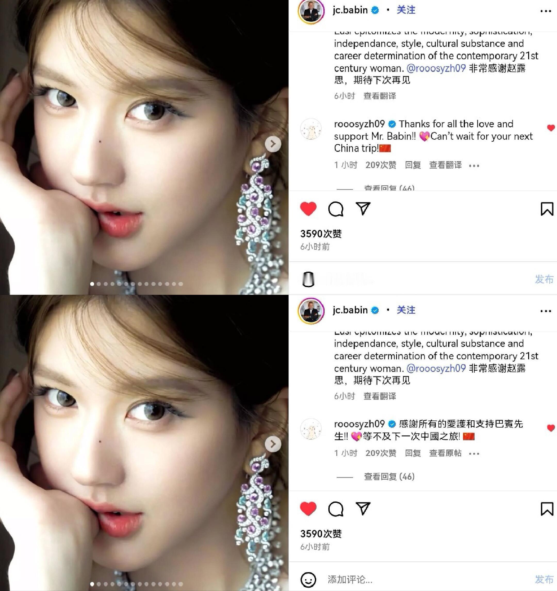 赵露思回复了今天发露儿的宝格丽总裁巴宾先生
