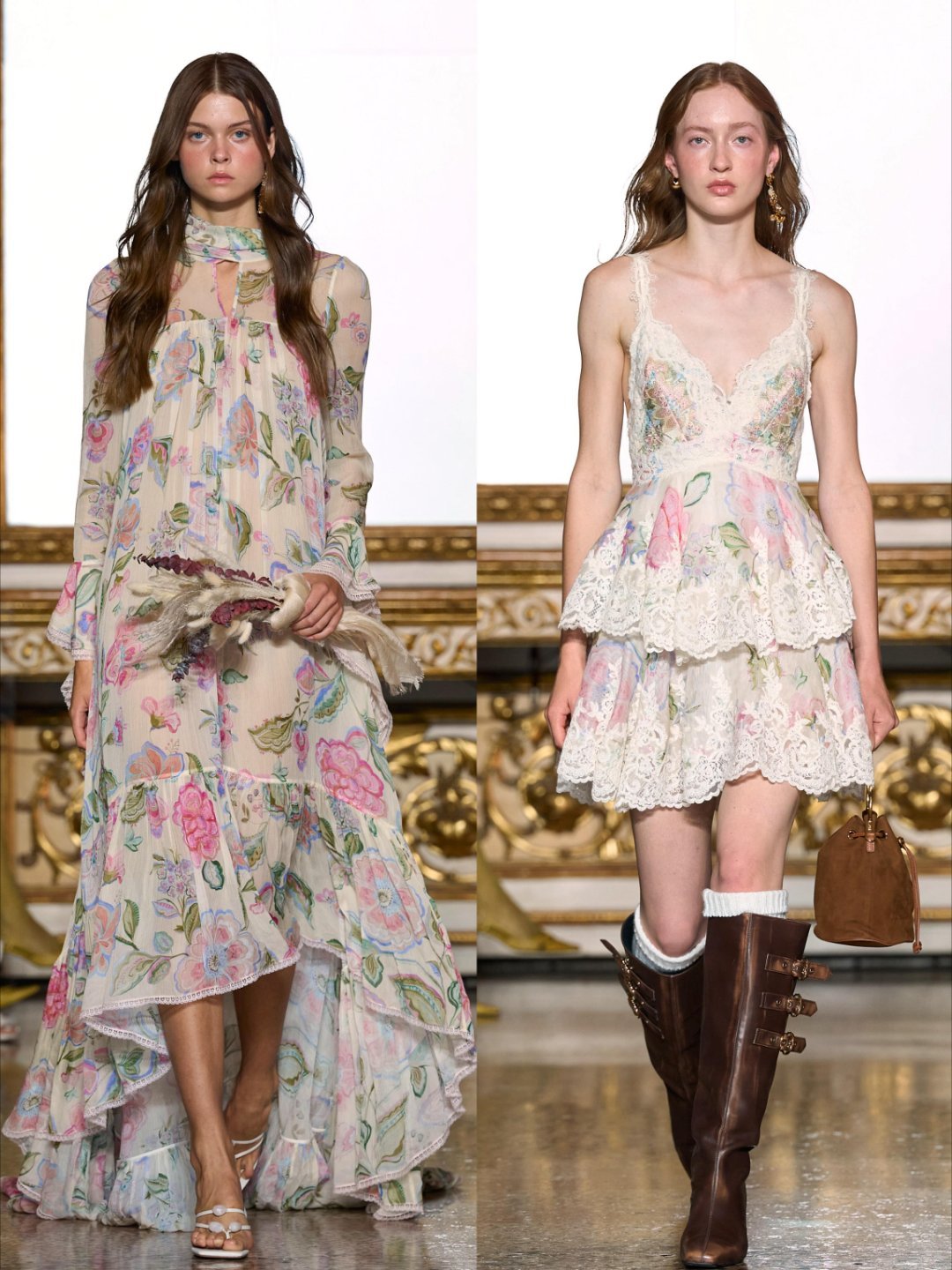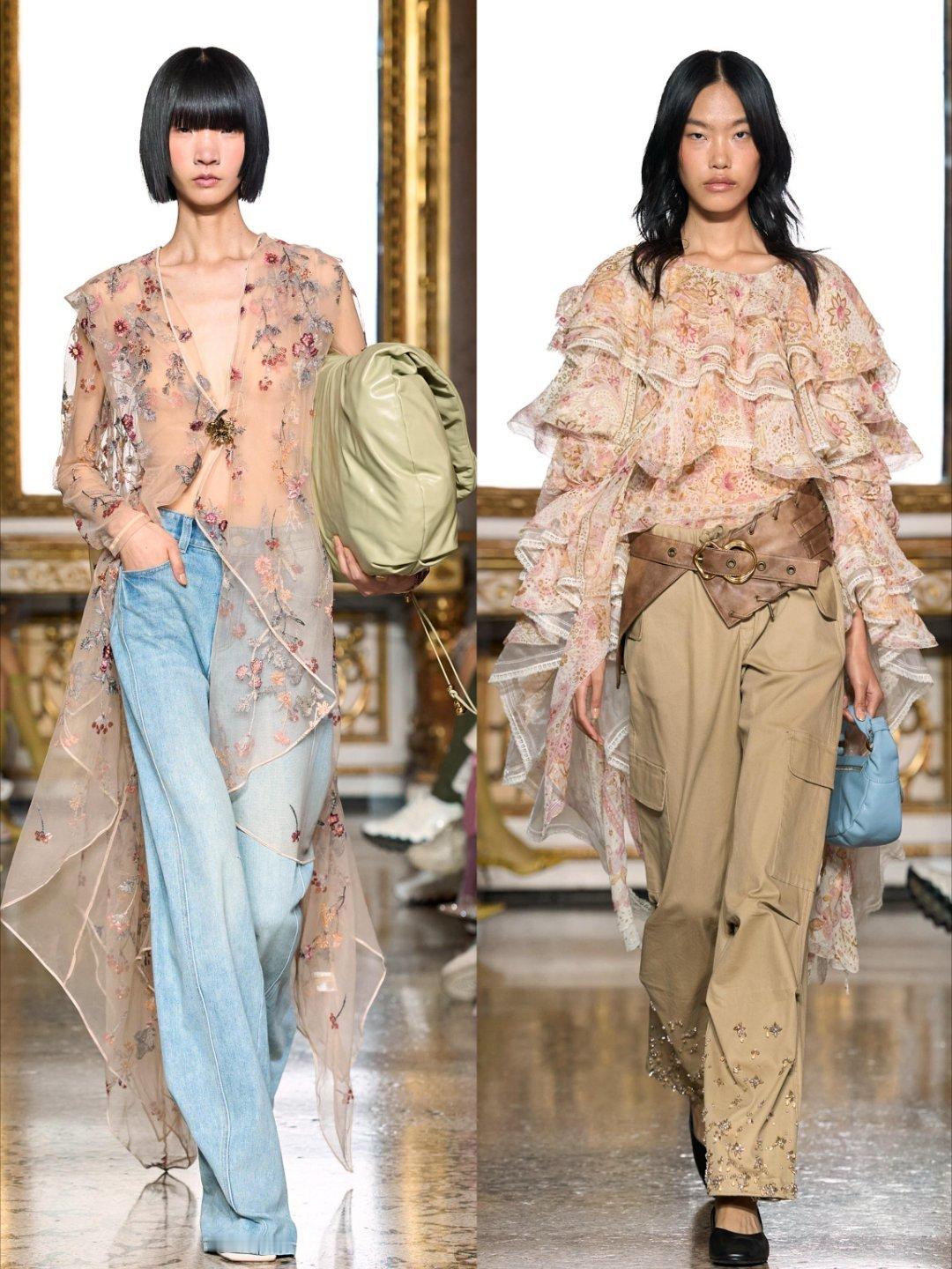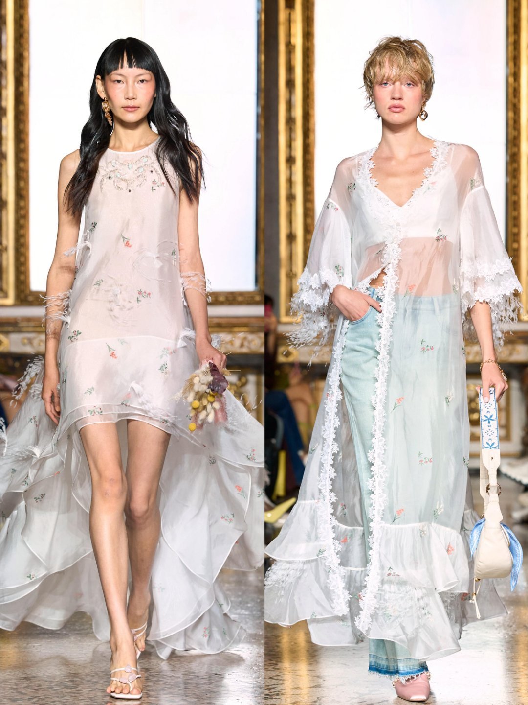 在美学融合上,品牌延续浪漫基因并进一步深化东西方碰撞:欧式巴洛克纹样与东方留白意境巧妙结合,细腻的绣工精准刻画枝头花韵与风吹落樱的瞬间,仿佛将自然场景定格于衣间;面料选择上,丝绸的顺滑、雪纺的轻薄与金属丝网的通透相互搭配,传递出“花开花落自有时”的东方自然哲思。