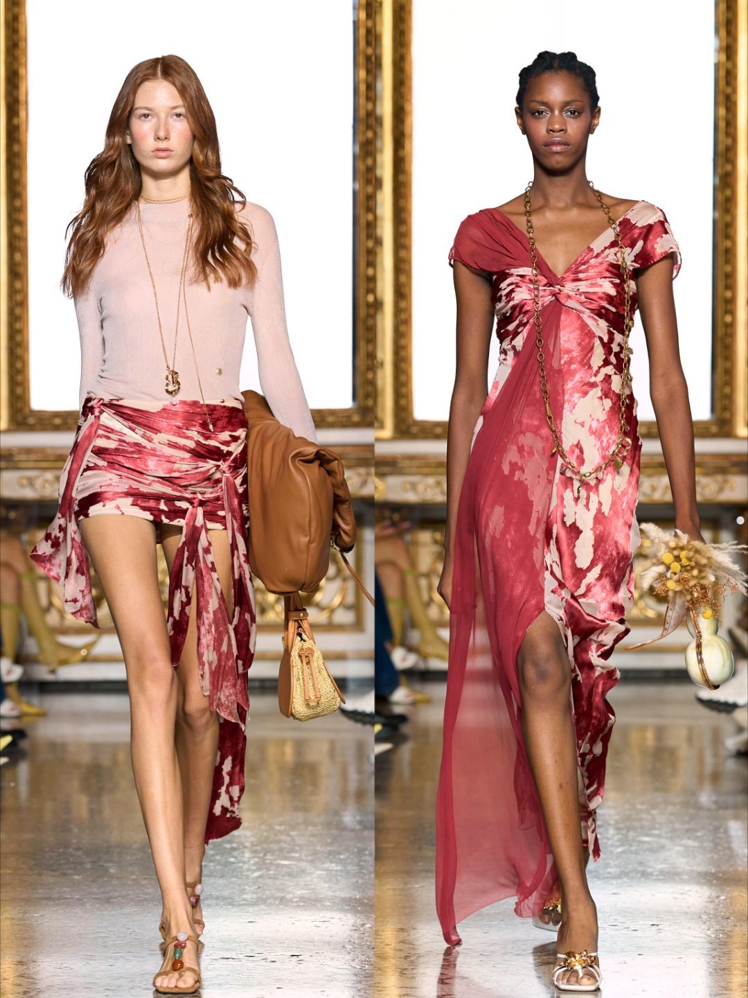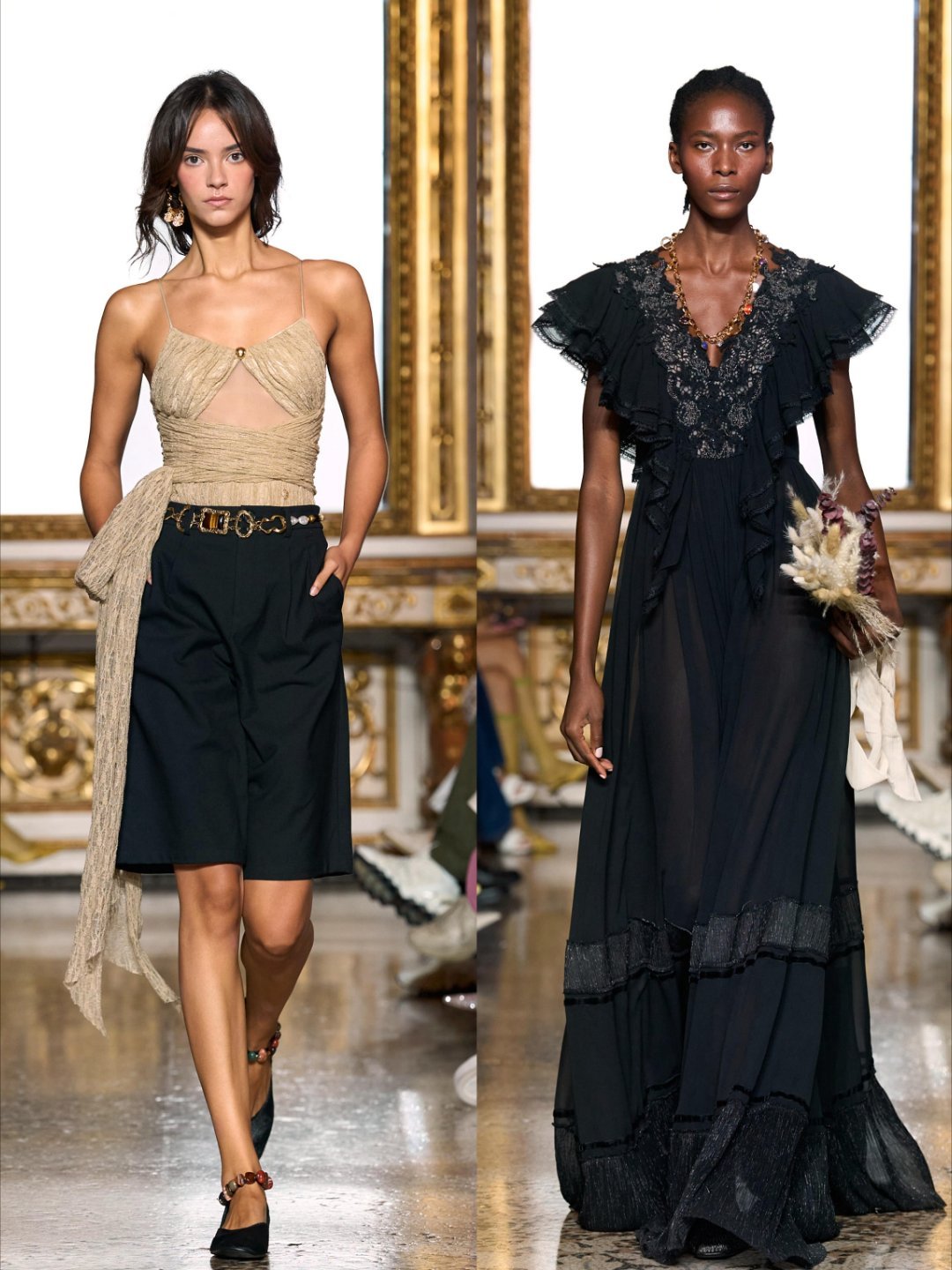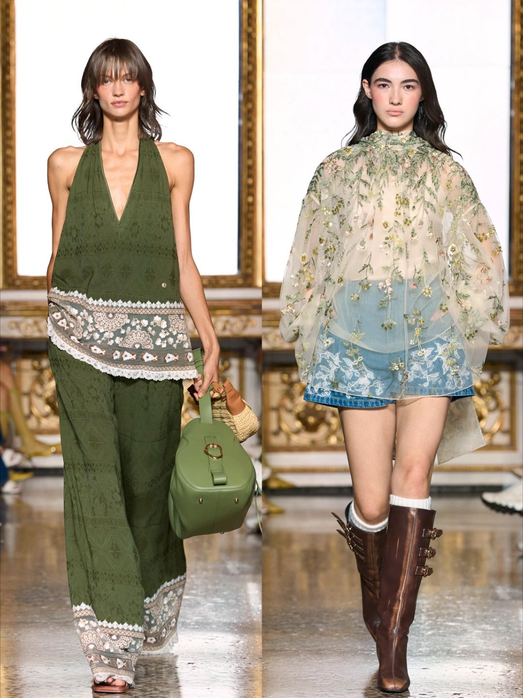 在美学融合上,品牌延续浪漫基因并进一步深化东西方碰撞:欧式巴洛克纹样与东方留白意境巧妙结合,细腻的绣工精准刻画枝头花韵与风吹落樱的瞬间,仿佛将自然场景定格于衣间;面料选择上,丝绸的顺滑、雪纺的轻薄与金属丝网的通透相互搭配,传递出“花开花落自有时”的东方自然哲思。