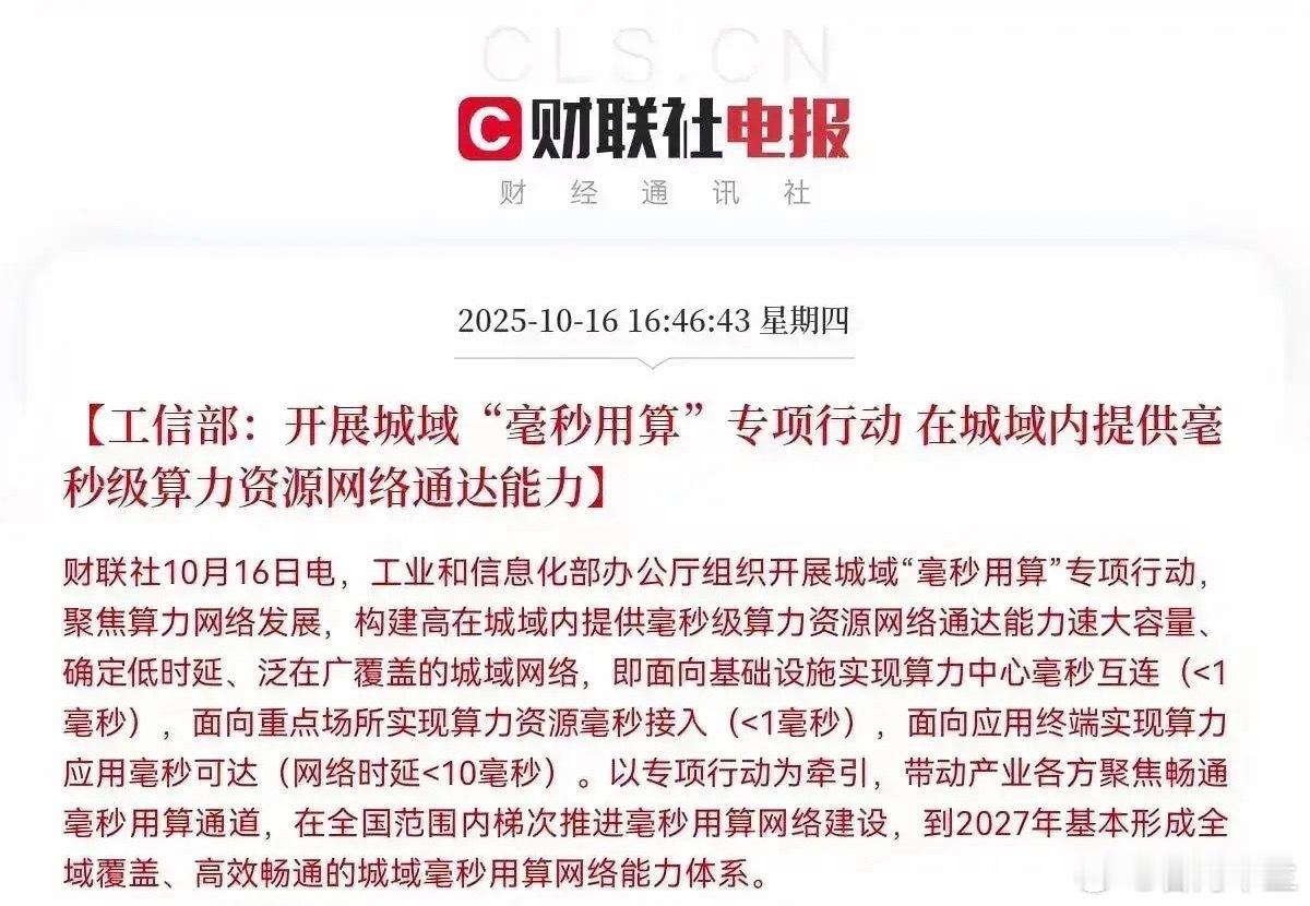 工信部开展的城域“毫秒用算”专项行动,核心是构建毫秒级低时延、大容量、广覆盖的城域算力网络,通过光传送网、确定性网络等技术验证,推动全光网覆盖、算力中心互联及入算专线服务升级,目标到2027年实现城域算力1毫秒时延圈覆盖率不低于70%,直接带动光通信设备、算力基础设施、网络服务等产业链的技术升级与市场扩容。
