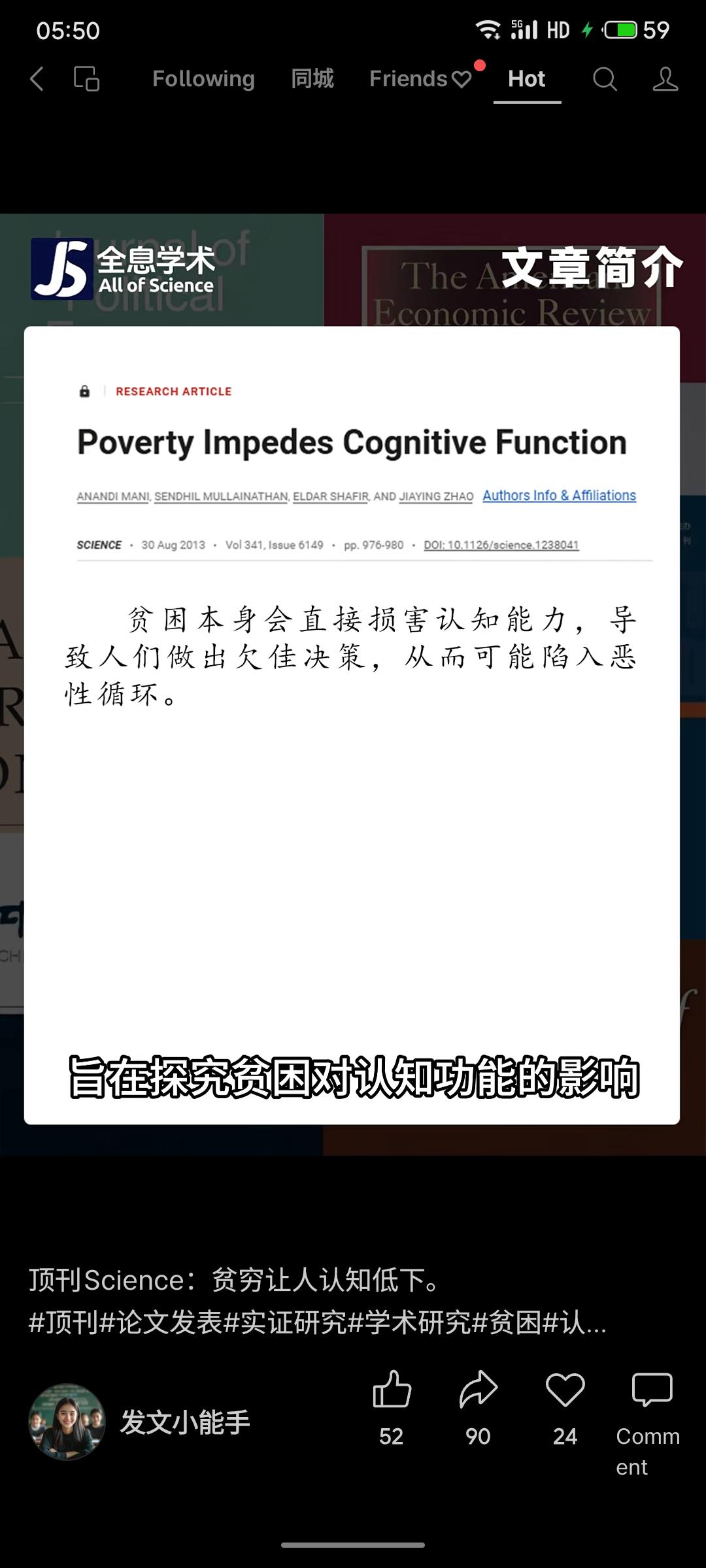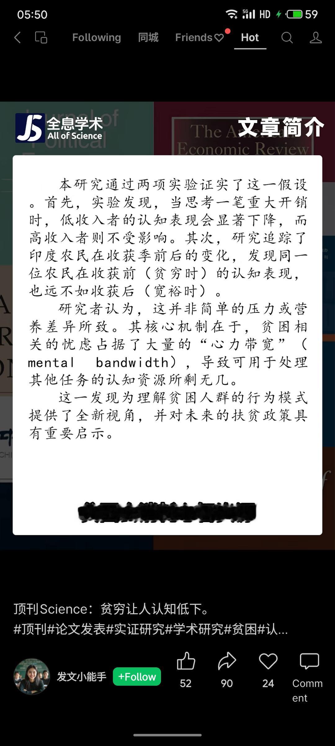 一项发表于《科学》的研究通过实验发现,贫困会显著消耗个体的心智资源,导致认知能力下降。无论是面对大额支出,还是收获前后的经济变化,贫困带来的财务忧虑会占用大量认知带宽,从而影响其他决策表现,揭示了贫困与认知间的直接因果关系。