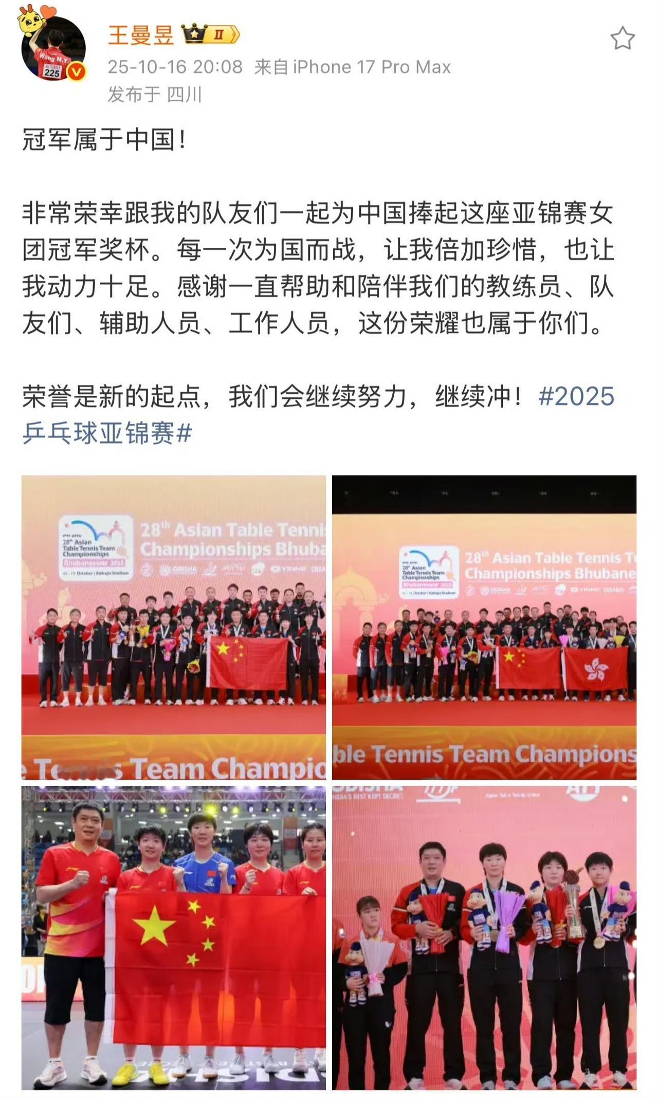 有8天没有看到王曼昱社交平台更新动态了,上一次更新是10月7日,现在,终于看到她再次更新了动态,果然文采飞扬,同时物归原主了! 她表示,冠军属于中国,确实如此!恭喜,女团在亚锦赛中大显身手,势如破竹3-0横扫日本队,再次展现出所向披靡气势! 鳗鱼真的好棒,全队的努力,终于物归原主,辛苦了!回国之后,多吃好吃的。 每一场的胜利都来之不易,我们下个比赛见,我依旧会继续给你不断加油。 王曼昱如同定海神针一般,关键时刻,稳扎稳打,出色完成任务!