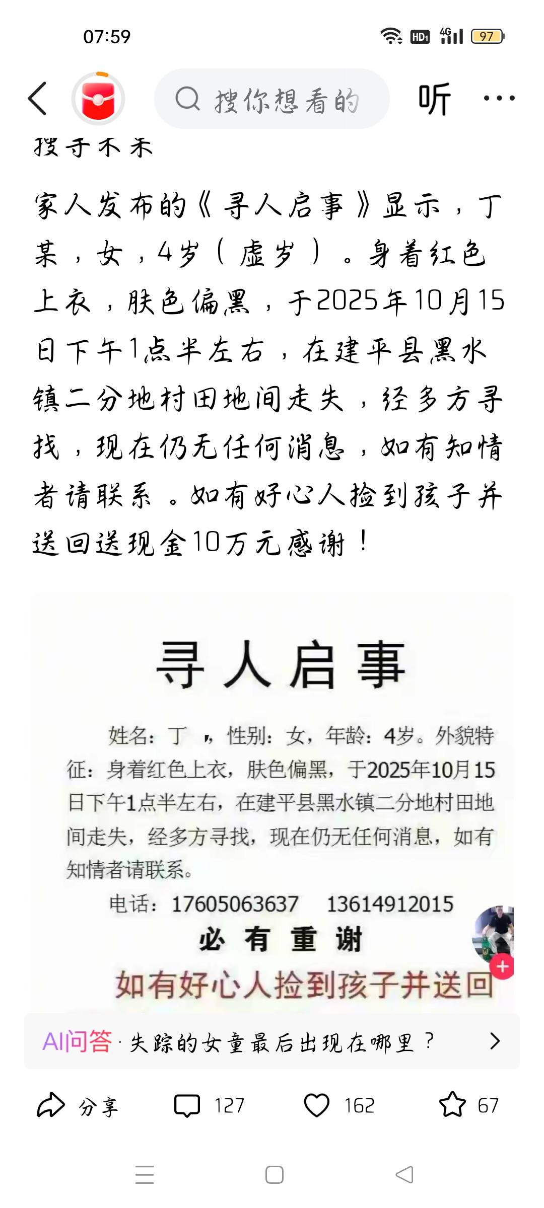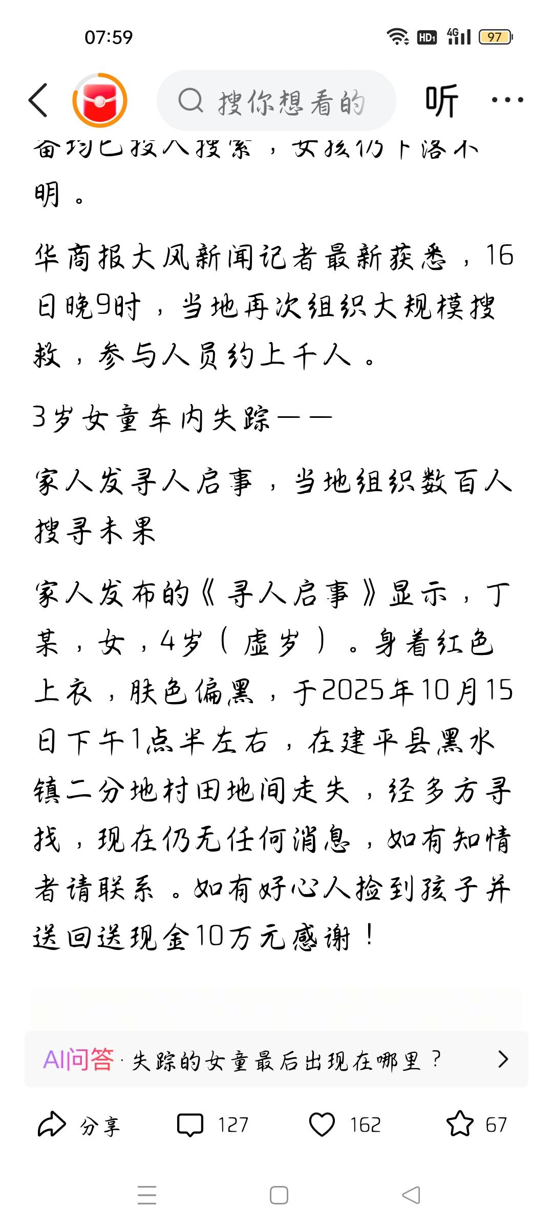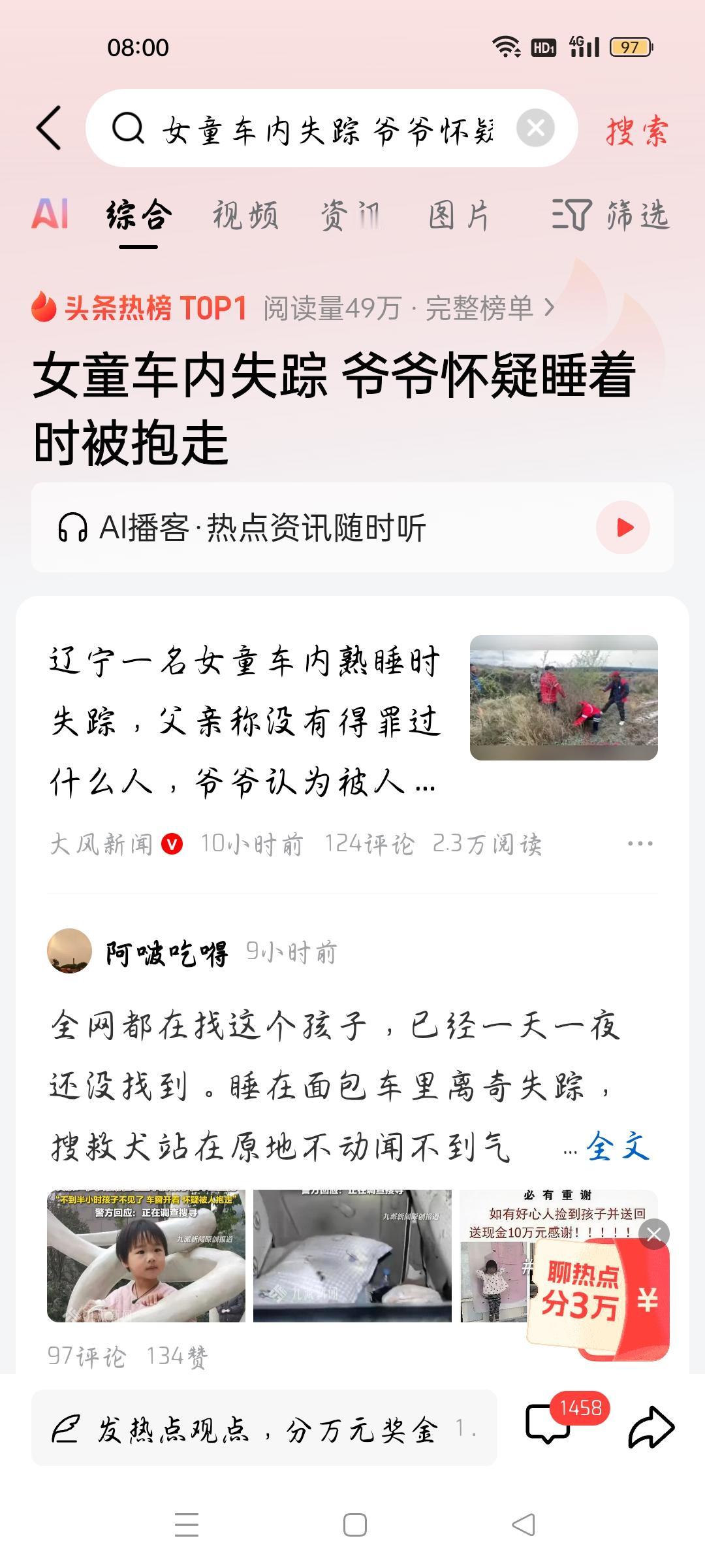 女童车内失踪,爷爷怀疑睡着时被抱走,我想说 据大风新闻报道,辽宁一女童车内熟睡失踪,父亲称没有得罪什么人,爷爷认为被人抱走,我想说,女童只有4岁,要说自己走,也走不多远,爷爷怀疑睡着时被抱走,个人认为,莫非碰到人贩子,爷爷奶奶做事离车比较远,人贩子早就瞄准这户人家,父亲称没有得罪什么人,爷爷奶奶有没有得罪什么人呢?个人认为,大概率是熟人作案,或者说是拐卖儿童集团所为,各位条友觉得呢?