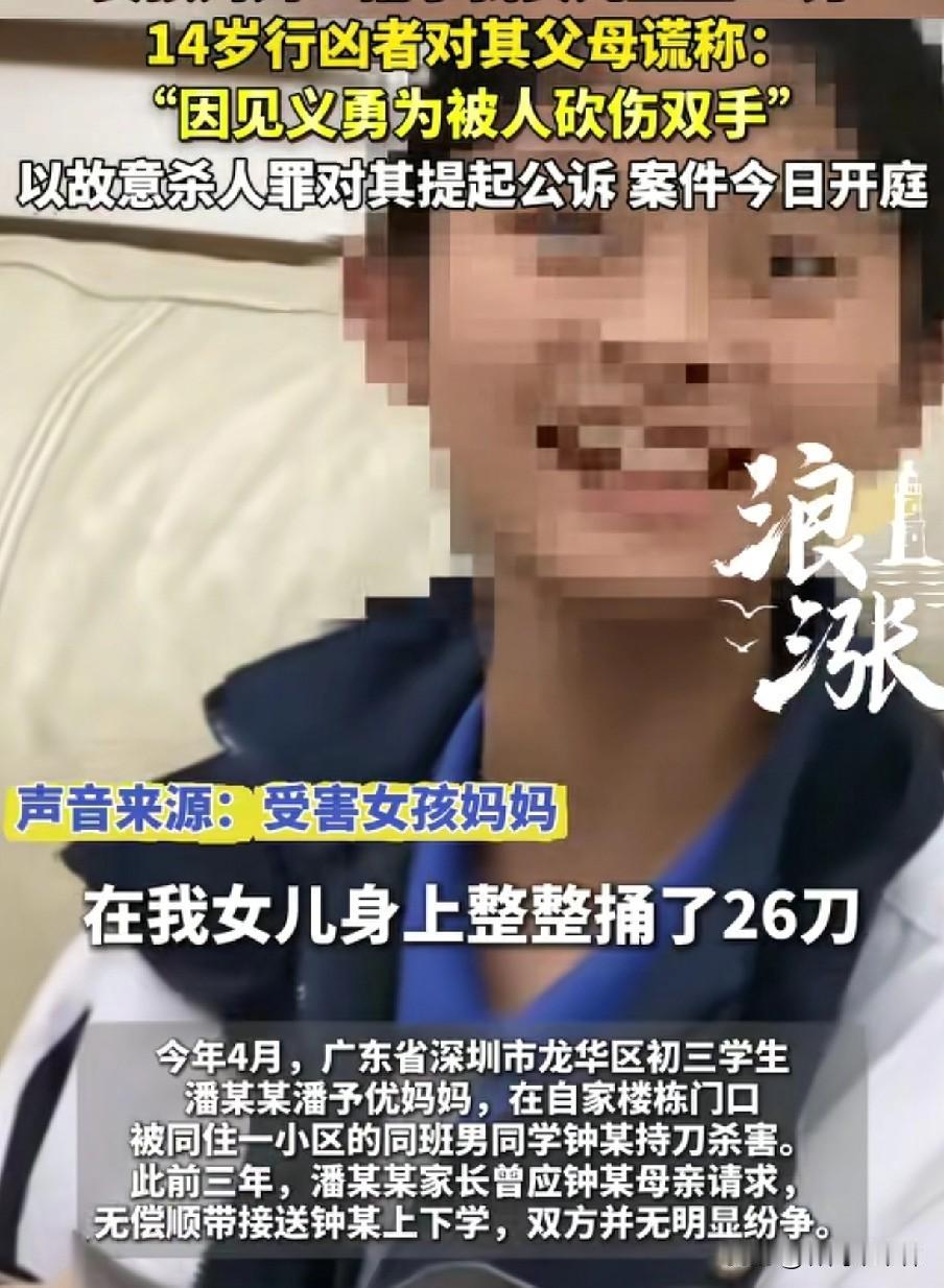 深圳14岁钟某捅死同学优优,有5点缘由建议从重量刑。 第一,行凶前曾搜索“14岁杀人法律责任”、“捅脖子能活多久”等问题,还提前网购好折叠刀,说明对方是有预谋的。 第二,优优受伤后倒下呼救,钟某又折返连捅数刀,鲜血染红了地面。见到对方受伤呼救,还追加伤害,具有故意杀人,置对方于死地的意图。 第三,行凶后,不施救,不求救,反而快速离开现场,不管对方死活,漠视他人生命。 第四,对家人撒谎称“路上遇到有人伤人,他见义勇为被砍伤”。用谎言掩盖恶性,丝毫没有悔意,更无自首情节。 第五,出事后,家人还在群里发布钟某是因为见义勇为受的伤,企图混淆视听。 至案发钟某被抓,钟家也没有向优优家道过一次谦,表达过任何悔意!在法庭上跪下磕头,也并不是因为认识到错误,而是因为怕死。 近几年未成年人犯罪层出不穷,真的建议法律要改一改了。生命面前一律平等!未成年身份不是行凶的保护伞! 唯有重判,才能警示其他人,防范更多类似悲剧发生! 持刀事件 伤人案 未成年人杀人 深圳遇害孩子