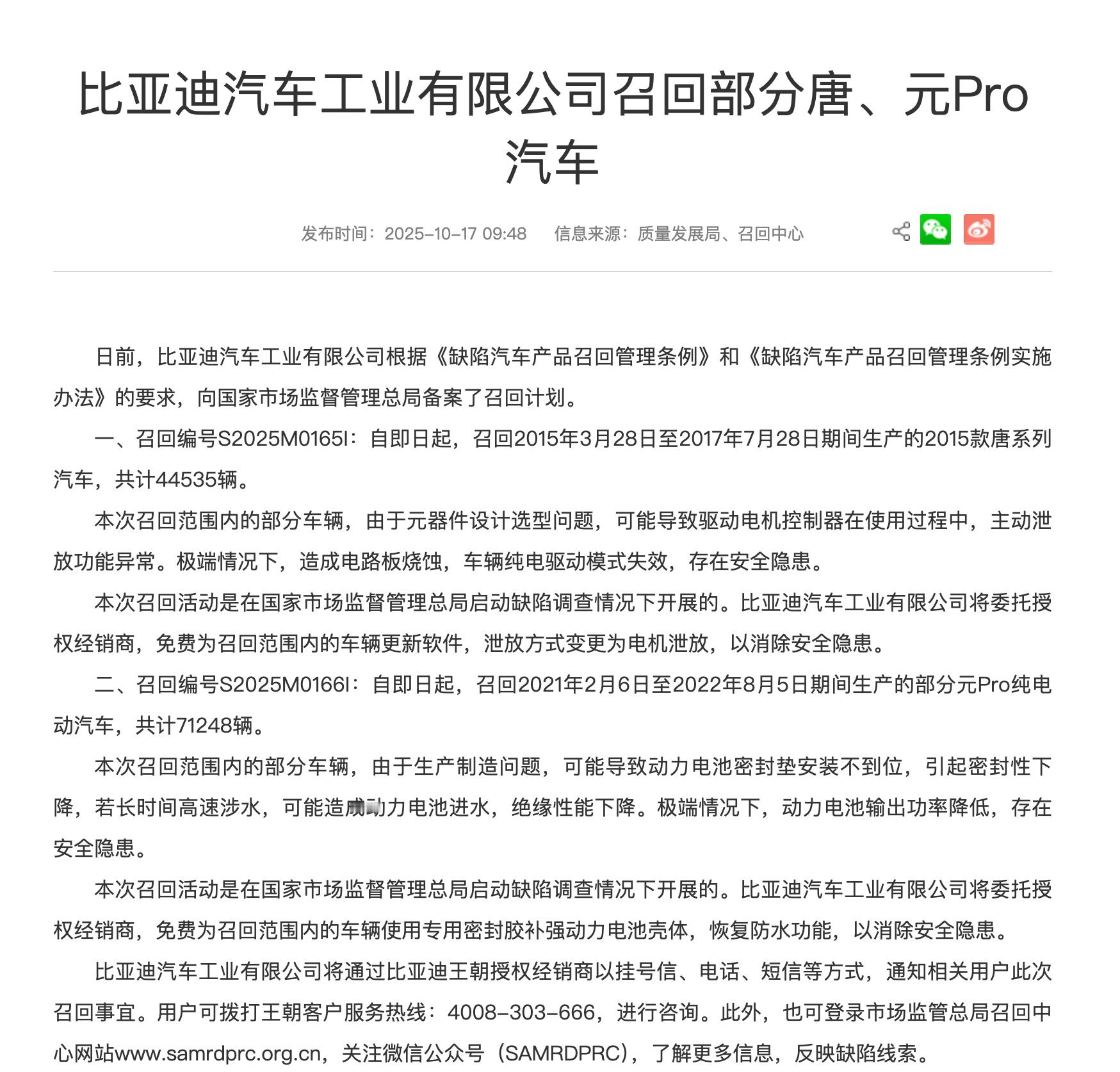 比亚迪突发大规模召回,涉及44535辆唐以及71248辆元Pro,共计115783辆。