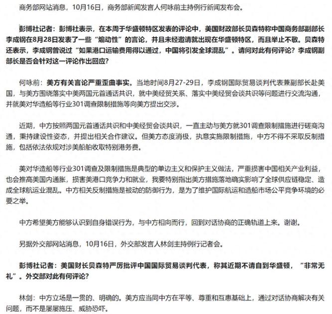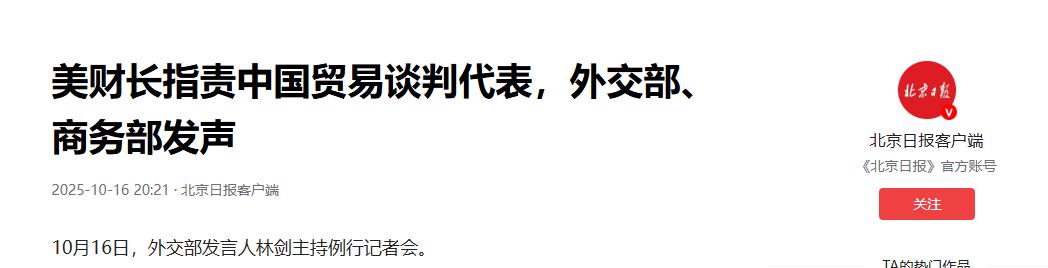 [微风]美财长公然指责中方谈判代表,我商务部当场怼了回去。 这事儿听着就火药味十足,外交场上难得见到这么直白的交锋。 10月16日,我们外交部和商务部的例行记者会,本来是按部就班的流程,却因为美国财长斯科特・贝森特的一番话,瞬间成了焦点。 他居然点名道姓地指责中国商务部副部长、中国国际贸易谈判代表李成钢,说他“发表煽动性言论”,还说他那次去华盛顿是“未经邀请”,并且“举止不敬”非常无礼。 这番话一出来,简直是把外交辞令扔到一边,直接开喷了。 面对这种近乎人身攻击的指责,咱们商务部可没惯着,发言人直接把话顶了回去,四个字定调:“严重歪曲事实”。 这回应简短有力,没有多余的废话,但分量十足。 这场隔空骂战,让原本就紧张的中美经贸关系,又添上了一层浓浓的火药味。 那么,事情的真相到底是什么?耶伦财长口中的“未经邀请”和“举止不敬”,又从何说起?时间得拉回到今年8月底。 当地时间8月27日到29日,李成钢国际贸易谈判代表兼副部长确实是赴美参加了一系列活动。但这里的关键细节是,他可不是像耶伦说的那样,不打招呼就跑到华盛顿去“串门”。 他是受邀参加在美国举行的贸易和投资相关会谈,行程是公开的,议题也是专业的。 在活动中,李成钢代表中方阐述了在经贸问题上的立场,比如对美国对华加征关税、滥用出口管制等措施表达了关切。 这本来就是谈判代表的本职工作,怎么就成了“煽动性言论”?在专业的场合,表达自己的观点,怎么就成了“举止不敬”?这其中的逻辑,恐怕只有美国人自己能解释清楚。 有意思的是,这件事过去快两个月了,耶伦财长为什么偏偏在这个时间点旧事重提,而且用词如此激烈?外交圈的节奏,往往比我们看到的要复杂得多。 这背后,或许藏着更深层次的考量。是不是美国国内遇到了什么压力,需要对外展示强硬姿态来转移视线?还是想在下一轮中美经贸对话前,先给中方来个下马威,抢占心理上的高地? 这种看似“破防”的举动,有时候恰恰是一种精心设计的策略。他们把一次正常的公务访问,刻意描绘成一场“不速之客”的挑衅,这本身就是在叙事战中抢占先机。 这场公开的交锋,暴露出的不仅仅是某个事件的分歧,更是中美之间深层次的信任赤字。当一方把另一方的正常外交活动解读为“冒犯”,当专业的政策阐述被贴上“煽动”的标签,这说明双方之间的沟通渠道已经出现了严重的问题,甚至连最基本的对话氛围都变得脆弱不堪。 这就像两个人本来想坐下来好好谈事,结果一方还没开口,另一方就说“你坐姿不对,眼神不尊重我”,这还怎么谈下去?这种互相猜忌、互相提防的状态,让任何一次接触都可能成为新的摩擦点。 这场围绕一次访问的口水战,看似是小事,实则折射出大国博弈的复杂与艰难。它提醒我们,在冰冷的贸易数据和关税清单背后,是活生生的人和充满变数的政治博弈。 当外交辞令被愤怒的指责所取代,当专业的交流被情绪化的标签所覆盖,我们不禁要问,这样的沟通还有意义吗? 这场公开的争执,究竟是一次偶然的失言,还是精心策划的施压策略?在这样的大国关系中,“尊重”的底线又在哪里?这盘棋,下一步会怎么走?欢迎在评论区留下你的看法。