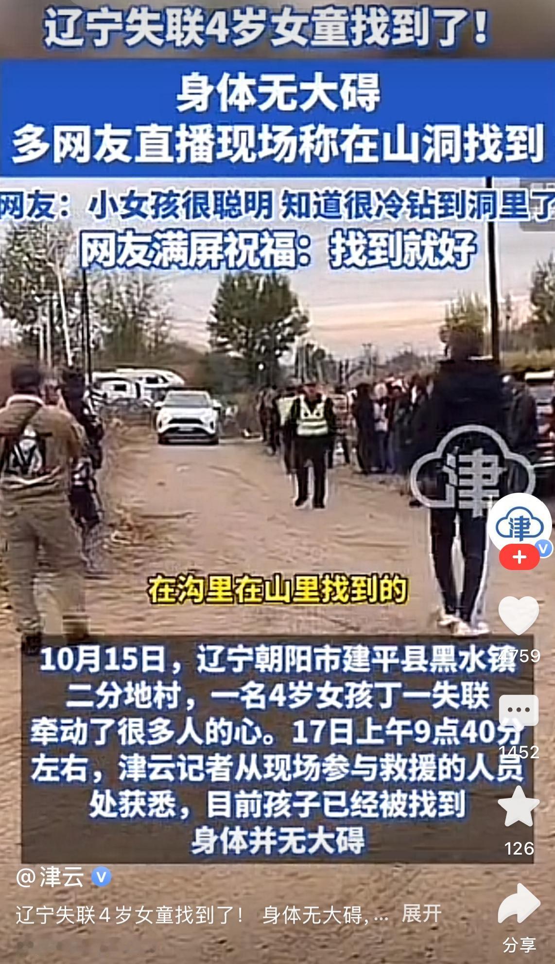 辽宁失联4岁女童已找到 根据警方通报和权威媒体报道,辽宁朝阳失联的4岁女童已于今日(10月17日)上午被安全找到,目前身体状况良好。 事件发生在10月15日。女童丁一(化名小壹)随爷爷奶奶到辽宁省朝阳市建平县黑水镇大营子村(也称二分地村)的地里干活。 • 爷爷奶奶因孩子正在车里睡觉,便将其独自留在车内去干活。约20分钟后返回,发现孩子不见踪影。车门未开,但车窗被打开。 • 接警后,当地迅速组织了大规模的搜救力量。据警方通报,累计投入搜救人员达12000余人次,并动用了警力、消防救援、无人机、热成像仪、搜救犬以及蓝天救援队等社会力量,进行了地毯式搜索。 • 找到女童:10月17日上午9时30分许,搜救人员成功找到了失联的女童。警方通报确认,孩子生命体征平稳。现场救援人员也表示,孩子身体并无大碍,意识清醒,能认出并称呼爷爷奶奶。