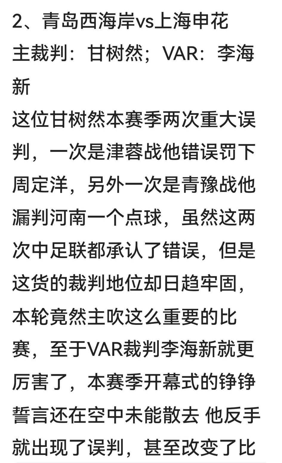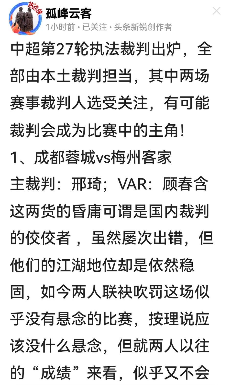 针对中超第27轮裁判名单,最大的变化是8场比赛全是本土裁判。有网友喊蓉城和西海岸小心,说中超进入收官阶段,足协坚决弃用外籍裁判,是为了体现高度控盘。 从过往洋哨执法的比赛结果看,老外的确不太听招呼,貌似海港和蓉城占了洋哨的便宜,导致争冠格局“大乱”。现在弃用洋哨,让联赛回归“正轨”,意图一目了然。 虽然是见证裁判威力的时候,但真心希望裁判们针对保级和夺冠大战,真正摸着良心吹罚,别根据安排进行“误判”。