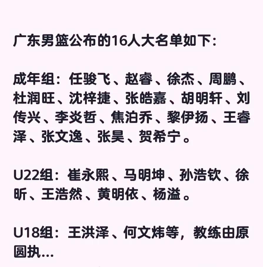 广东全运队成年组男篮十六人名单,按古代战将可分为—— 上将三员:徐杰,赵睿,胡明轩。 战场主力,当仁不让,广东三少,舍我其谁。 老将两员:周鹏,任骏飞。 经验丰富,安定军心,两人显赫辉煌成就,放眼目前各镇诸侯无人可比。 七骁骑大将:焦泊乔,刘传兴,沈梓杰,杜润旺,贺希宁,王睿泽,李炎哲。 能征善战,名声在外,各有独到之处。 四卫骑将军:张昊,黎伊扬,张文逸,张皓嘉。 各怀本领,主随统帅,排兵布阵的很好补充。 此十六人名单,可谓人才济济,都能独当一面,单挑群殴,都是一流。 战场上如果一字排开,对手只有胆战心惊的份。