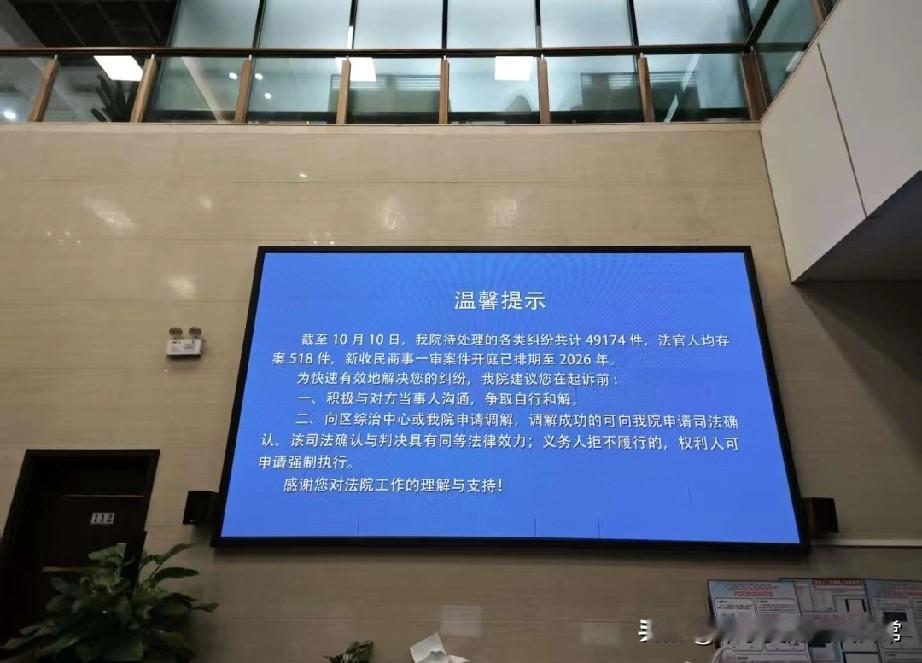 法院案件审不完,根本审不完! 去法院立案,被一块显示屏惊掉下巴:案件排期直接干到2026年!法官人均扛着几百个案子,老百姓想维权,得先熬个一年半载。 咱就说,谁愿意自家纠纷像泡老坛酸菜一样“腌”着?可法院也冤,案子多到堆成山,法官们怕是连喘口气的功夫都没有。
