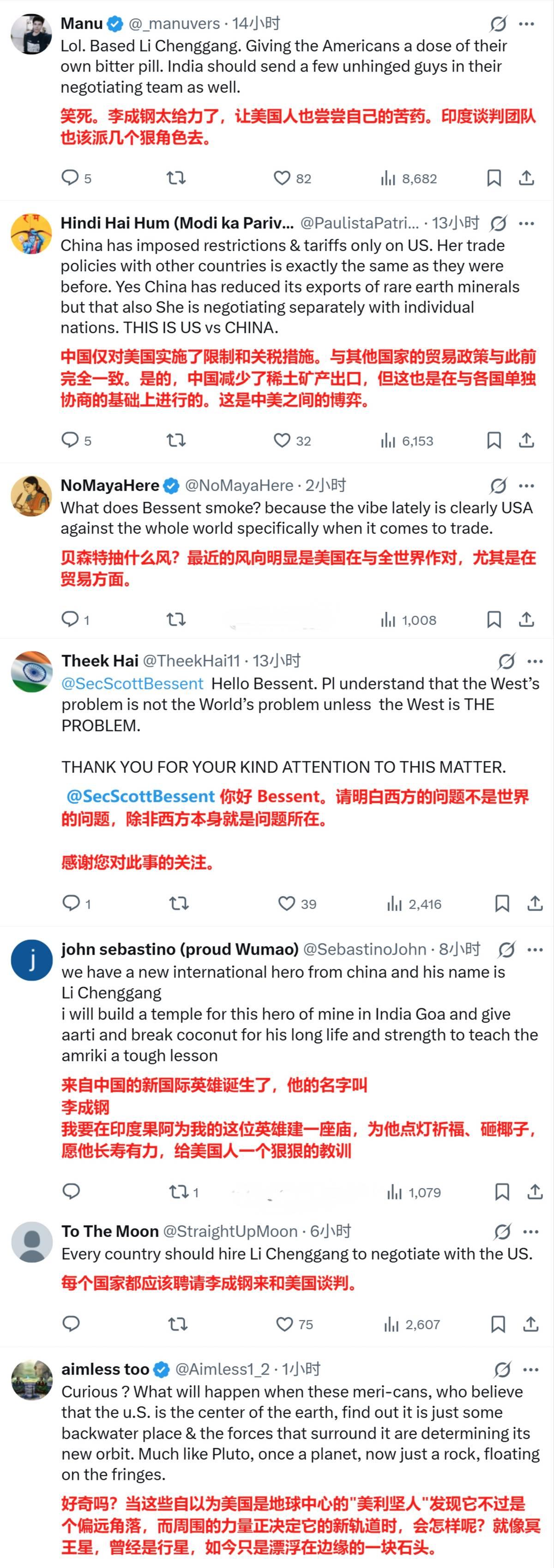 美国财长气急败坏,指责中国代表“不讲武德”,全球网友:李先生是英雄! 这两天,美国财长贝森特气急败坏地向全世界告状,罕见地公开点名谴责了中国谈判代表、商务部副部长李成钢,指控其在谈判时“战狼”、“不讲武德”。结果,全球网友不仅没有支持美国人,反而群嘲起了贝森特。 有人说,李先生太给力了,每个国家都该请他当谈判代表,让美国人也尝尝自己种下的苦果。有人说,来自中国的新国际英雄诞生了,他就是李先生!还有人说,当美国在谈判桌上赢不了的时候,他们就去媒体上抱怨,但中国人压根不在乎。甚至连美媒都出来踩贝森特,说他罕见的公开谴责,揭示出特朗普政府内部对中国的深切挫败感。 至于李副部长到底说了什么让贝森特气成这样,目前有两个说法。 第一个是,当时贝森特声称要加征港口费,劝中方不要反应过激,李副部长当场表态,大意是,如果美国加征港口费落地,中国有能力打击美方的整个全球体系,别怪我们没有提前警告。但贝森特不信,以为中方只是在吓唬他。结果这几天我们的多项措施落地,贝森特才发现,中方是真的当面对其发出了威胁,所以才原地破防,又气又恨,极为失态。 第二是,有据称是美方谈判翻译的人发帖说,李副部长在谈判过程中当着美国人的面打电话通知国内,可以启动对英伟达的反垄断调查,并且是先用中文打了电话,再让翻译当众转述给了美国人听。贝森特当场震惊了,因为这届特朗普政府官员压根没见过对他们如此强硬的中国人。